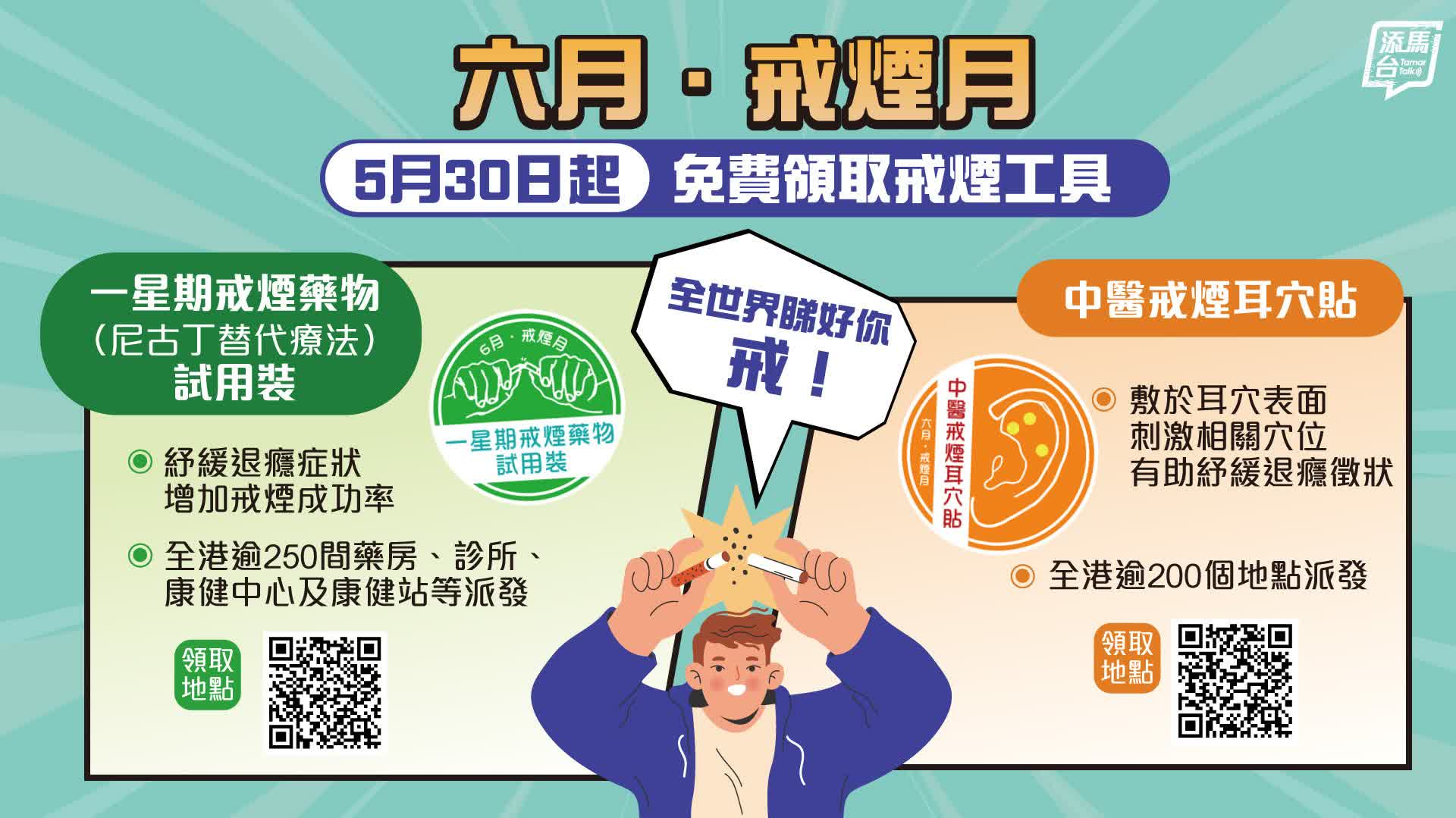 由5月30日起,有吸煙習慣人士可免費領取一星期戒煙藥物(尼古丁替代療法)試用裝,或中醫戒煙耳穴貼。戒煙人士只須前往貼有橙色「中醫戒煙耳穴貼」標誌或綠色「一星期戒煙藥物試用裝」標誌的地點,經簡單評估後,以「戒煙達人」應用程式掃描二維碼,便可以免費領取。