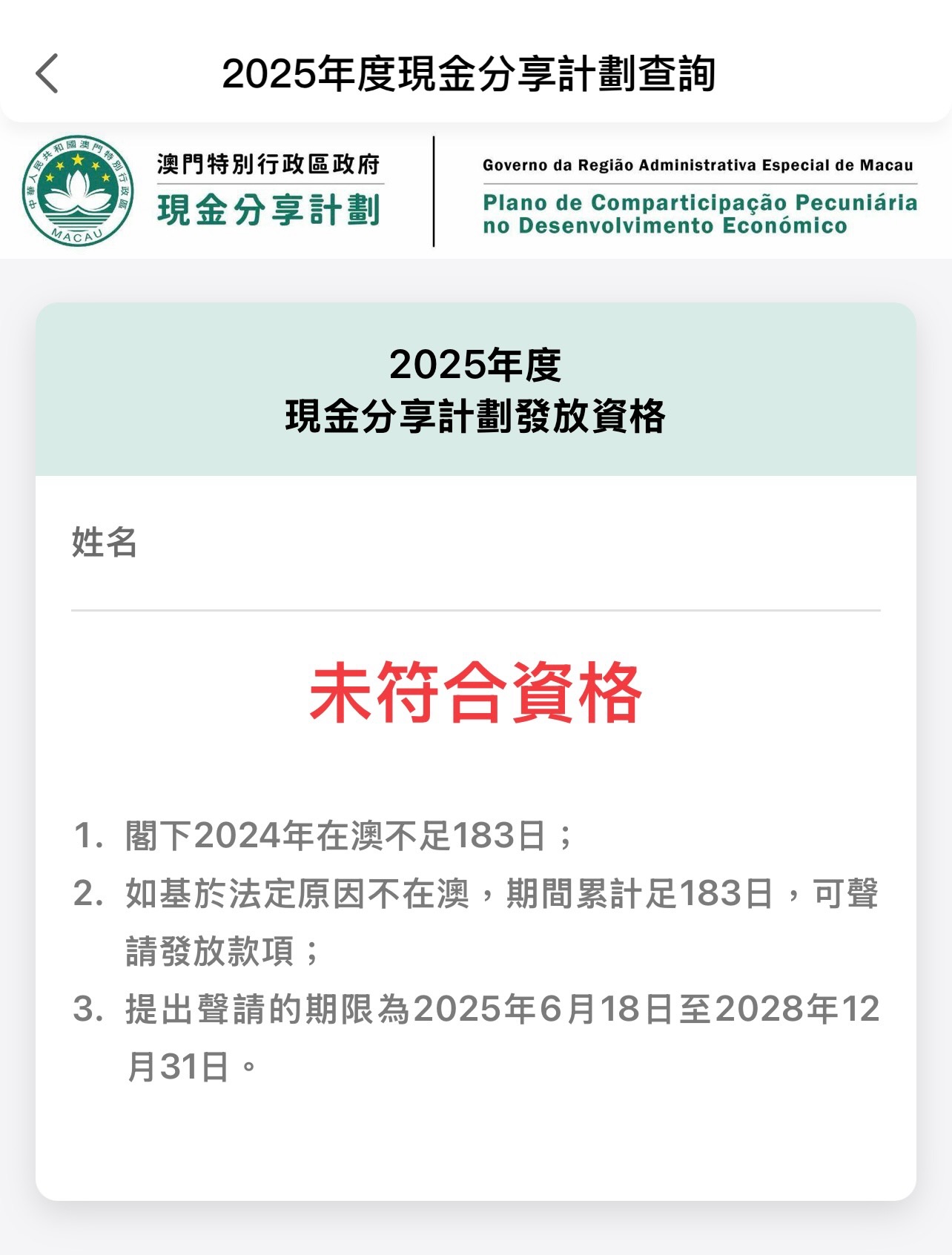 即日起澳門居民可登入「一戶通」或現金分享計劃網頁查詢是否符合發放資格。符合資格的人士會按照既定的時間表發放。現為全職家庭主婦的澳門居民李小姐對於新設183天的條件表示不同意,她稱前年兒子出世後長期居住珠海照顧小朋友,而丈夫長期在內地工作,因此在新條件下,他們一家三口都未能符合資格,有感可惜;另有市民黃小姐認為新增規定可合理運用公帑,能確保對澳有持續實質付出的居民才具備發放資格。