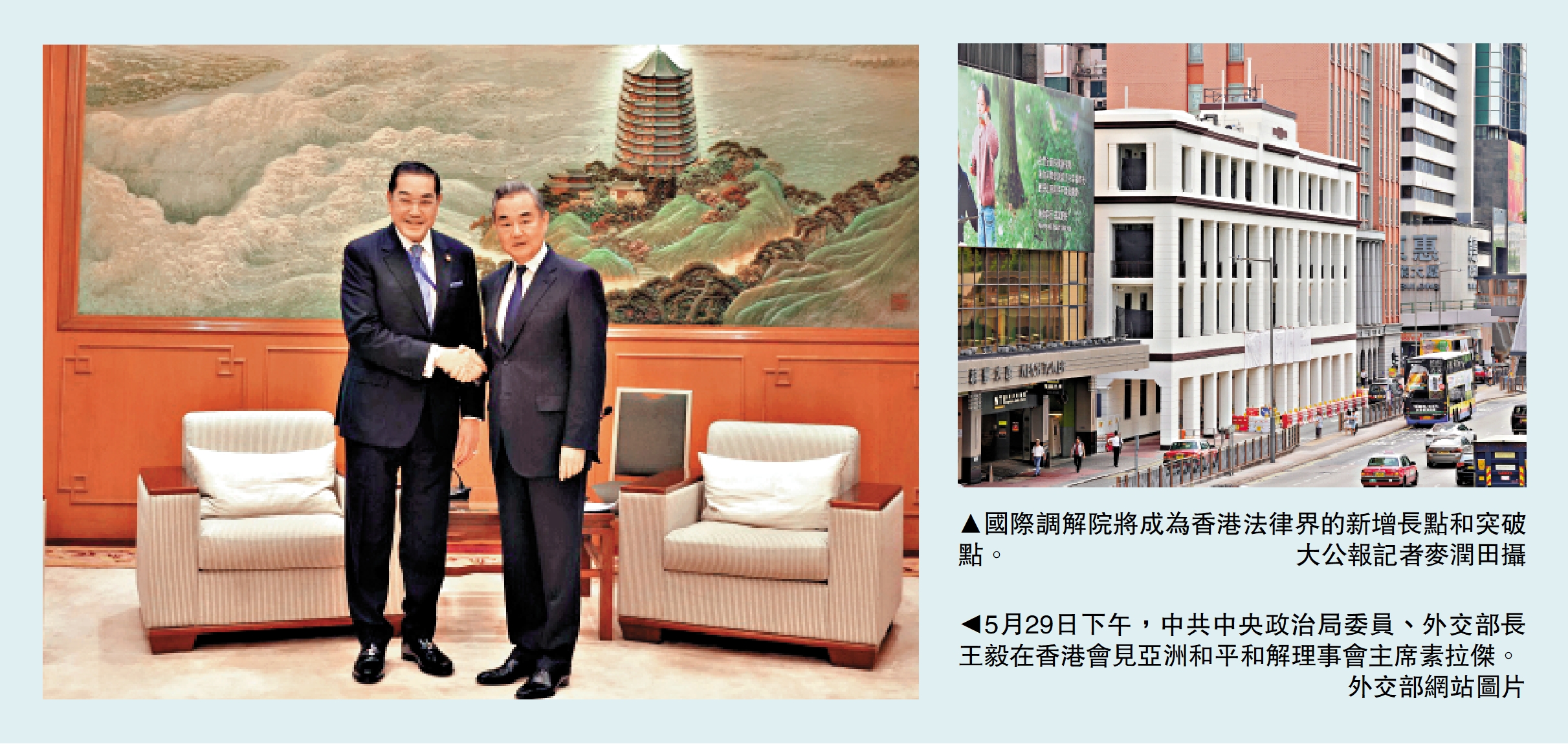 大公報據新華社報道:5月29日下午,中共中央政治局委員、外交部長王毅在香港會見出席國際調解院公約簽署儀式的亞洲和平和解理事會主席、泰國前副總理素拉傑。