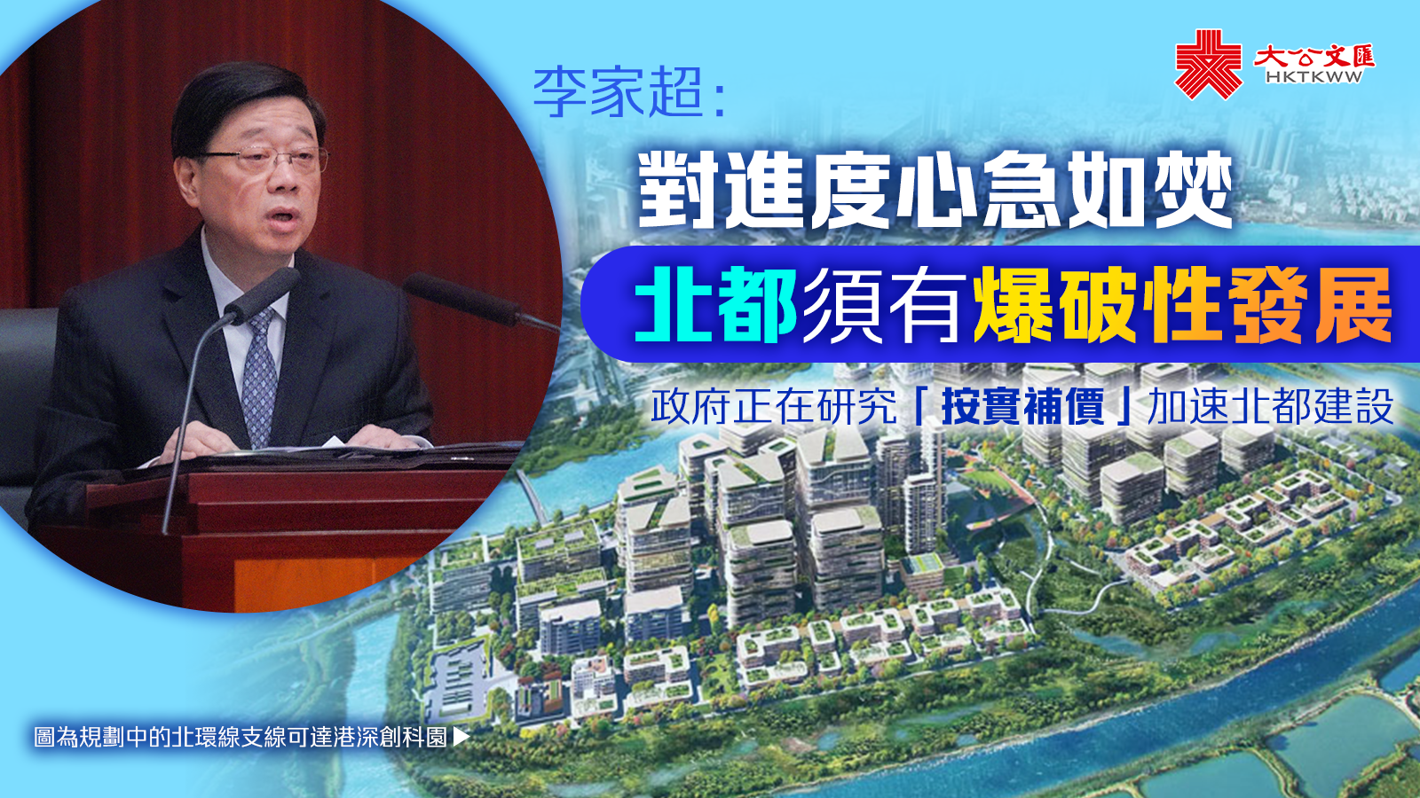 李家超表示,北都面積約佔香港三分之一,人口亦將佔三分之一,除了土地房屋發展可以改善民生外,更是香港經濟發展的新引擎,帶來產業就業,帶來創新科技,更帶來香港和內地協同發展、優勢互補的雙贏格局,可以創造「一加一大於二」的爆破性發展,讓各位市民都可以分享發展紅利、改善生活,有更美好的未來。他還透露,政府正在研究「按實補價」加速北都建設;今年下半年,第一批科研人員將開始進駐河套香港園區。