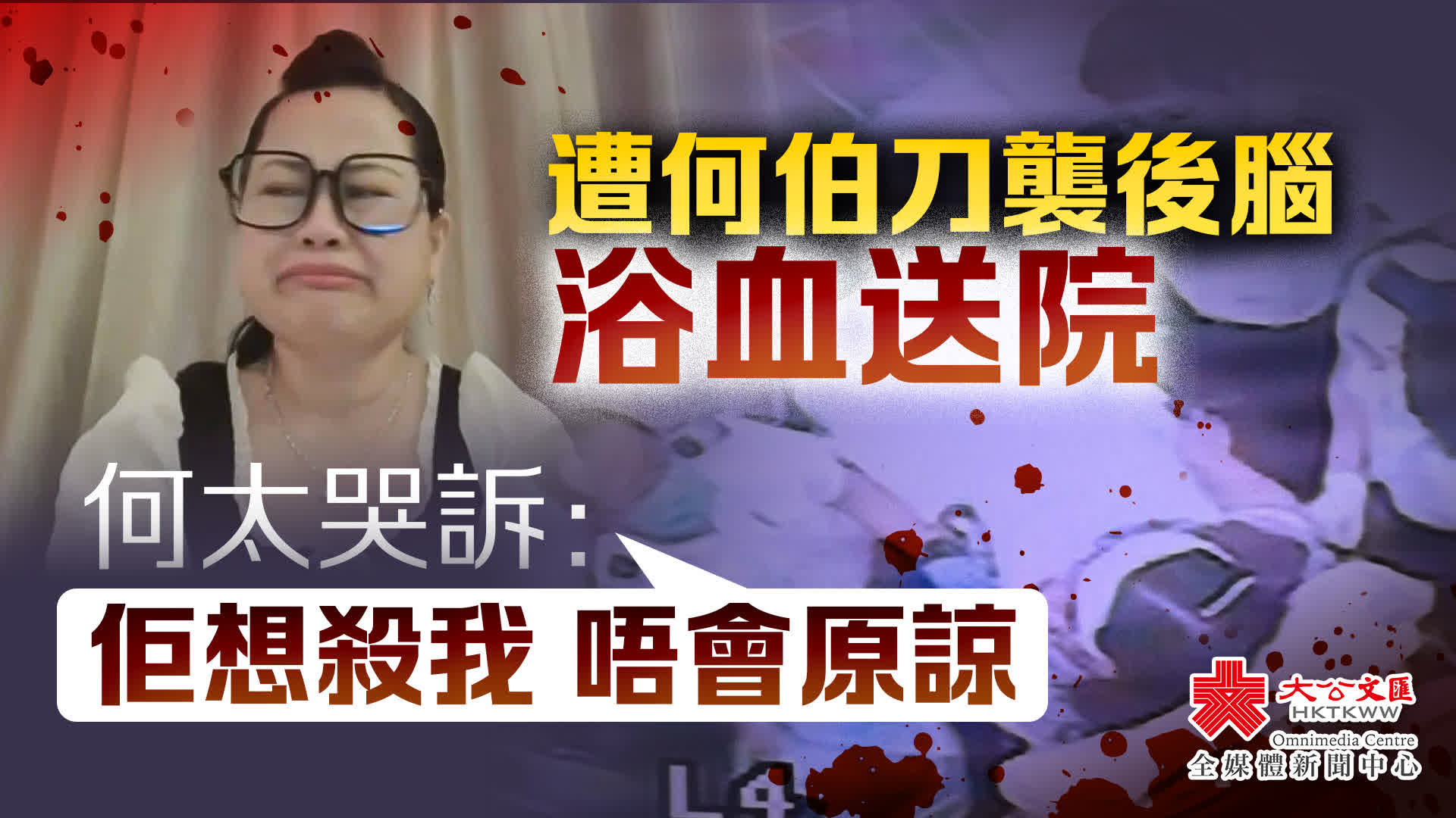 何太回應傳媒時哭訴:「我唔會原諒佢!我對你(何伯)咁好, 你竟然傷我……」她眼泛眼光憶述事發經過,指偷襲沒有先兆:「佢(何伯)想殺我,佢攞把刀喺後面襲擊我。咩事都冇發生,佢偷偷地襲擊我想殺我。」對於因何事爭執,何太沒有回應。