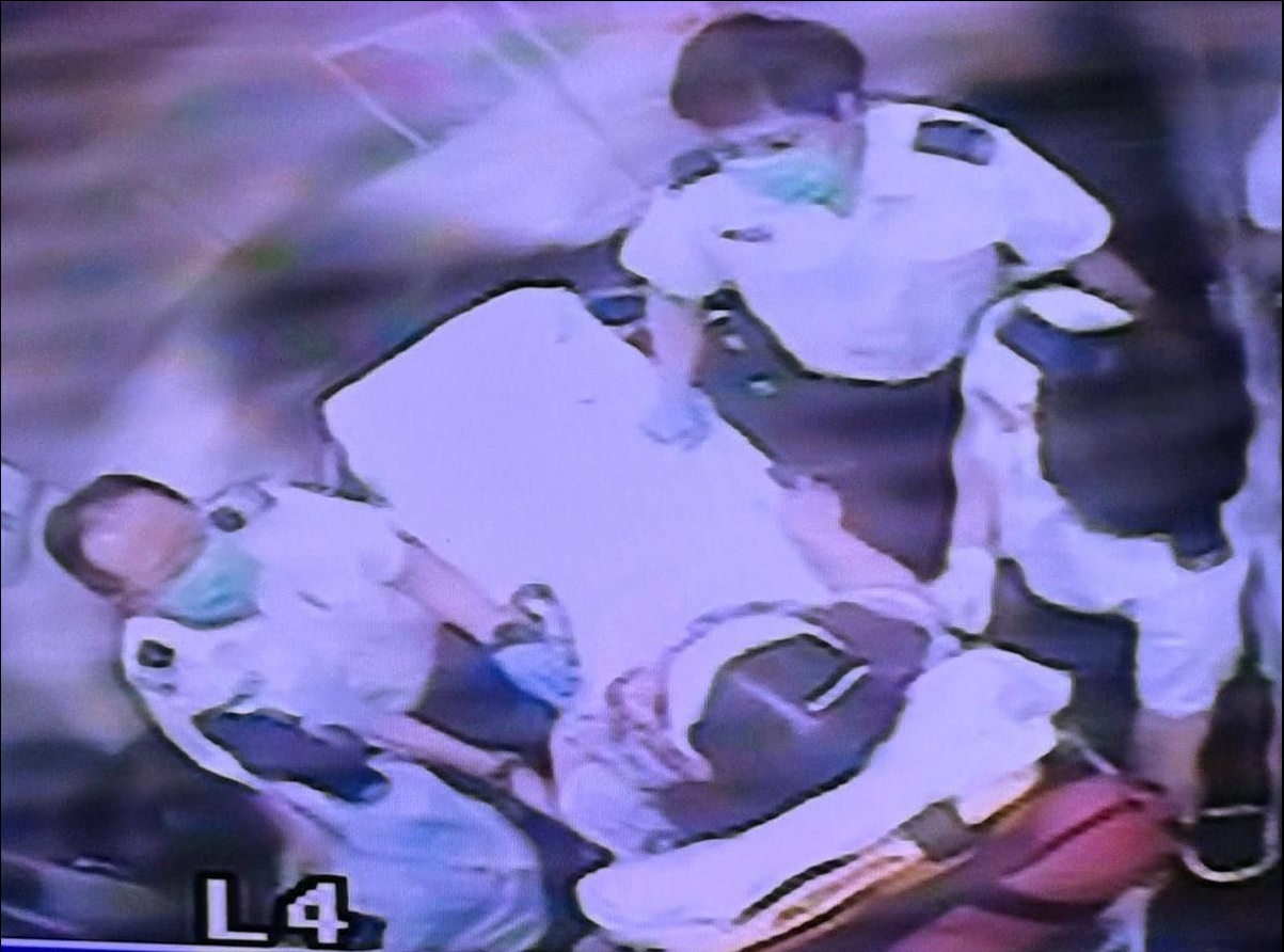 何太在醫院急症室經治理後,由醫護人員推入病房留院,只見她頭部有紗布包紮,合上雙眼。