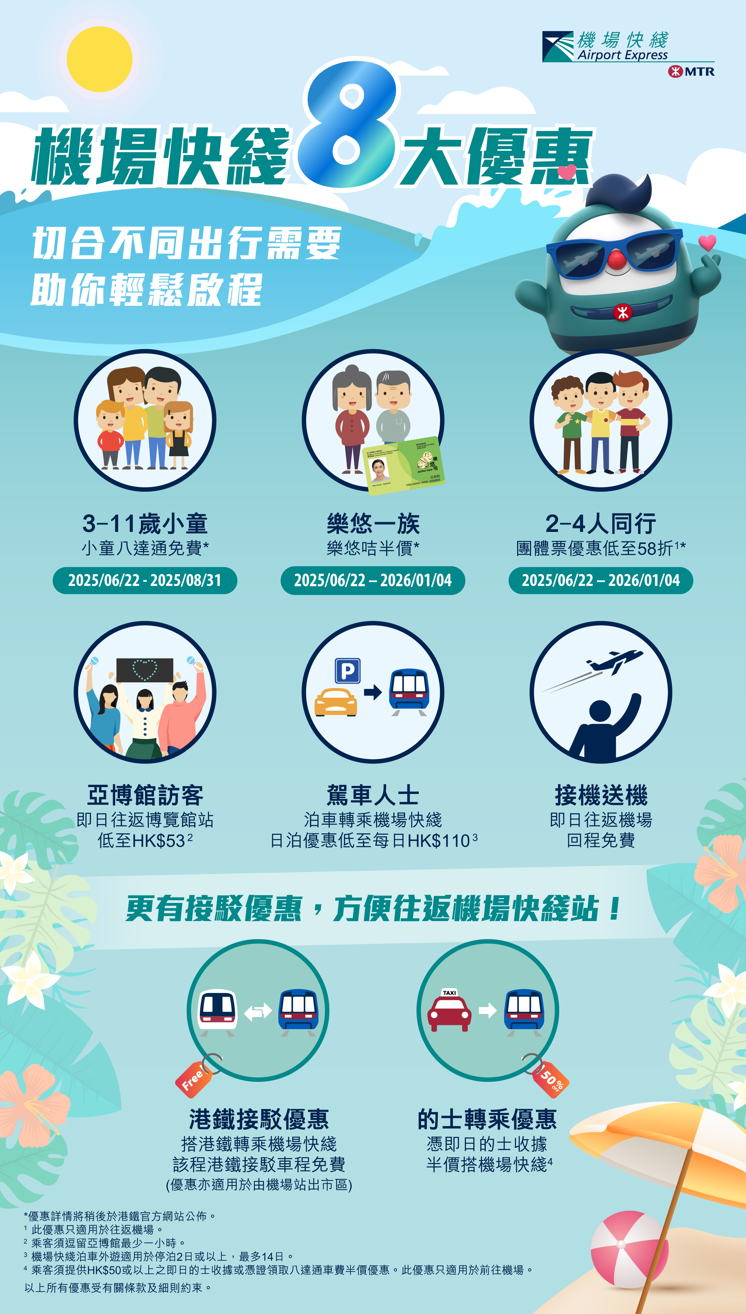 今次的小童免費及樂悠咭半價限定優惠,將與6月22日起生效的機場快綫新票價同日推出。3至11歲小童由6月22日至8月31日期間,憑小童八達通出入閘,即可免費乘搭機場快綫往返市區車站(香港、九龍或青衣站)及機場站。至於樂悠咭持有人(即60歲或以上香港居民)亦可於6月22日至明年1月4日期間,使用樂悠咭半價乘搭機場快綫往返市區車站及機場站。