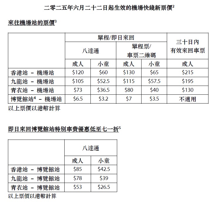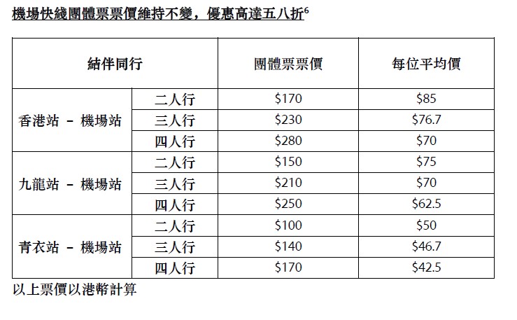 另外,深受歡迎的機場快綫團體票(包括二人、三人及四人行),其優惠票價亦會維持不變超過半年至明年1月4日,優惠低至五八折。同時,為方便市民及旅客快捷來往博覽館參與盛事活動,機場快綫會繼續提供即日來回博覽館站特別車費優惠,成人使用八達通即日往返市區車站至博覽館站收費低至53元,平均每程低至26.5元,優惠低至七一折,八達通免費港鐵接駁優惠同時適用,方便市民利用港鐵接駁全港各區。