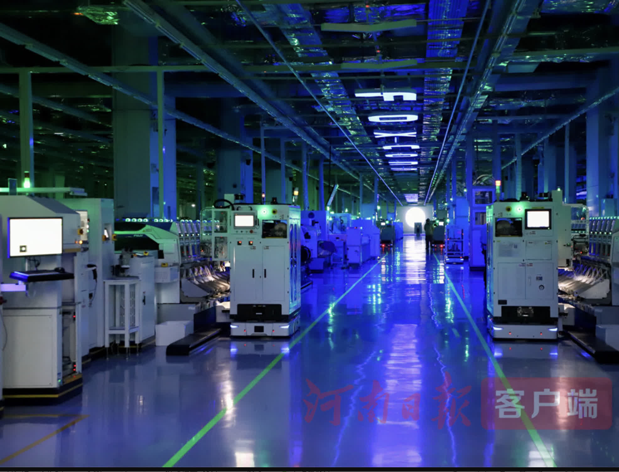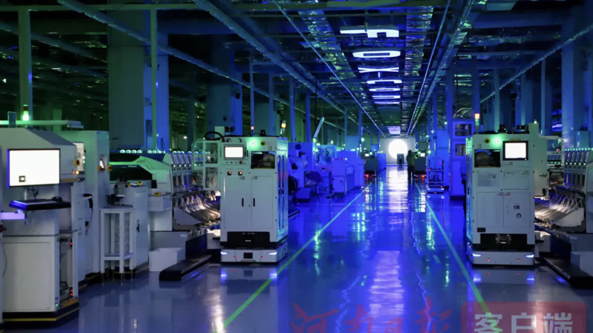穿過智能風淋室,吹掉身上的靜電和浮塵,就進入到鄭州富士康「燈塔工廠」。在這裏,看不到員工操作與走動,隨着綠色指示燈閃爍,一台台智能設備井然有序地「自主」完成從物料存儲、上料、生產到成品包裝出貨的所有環節,實現一鍵校正、柔性布局。