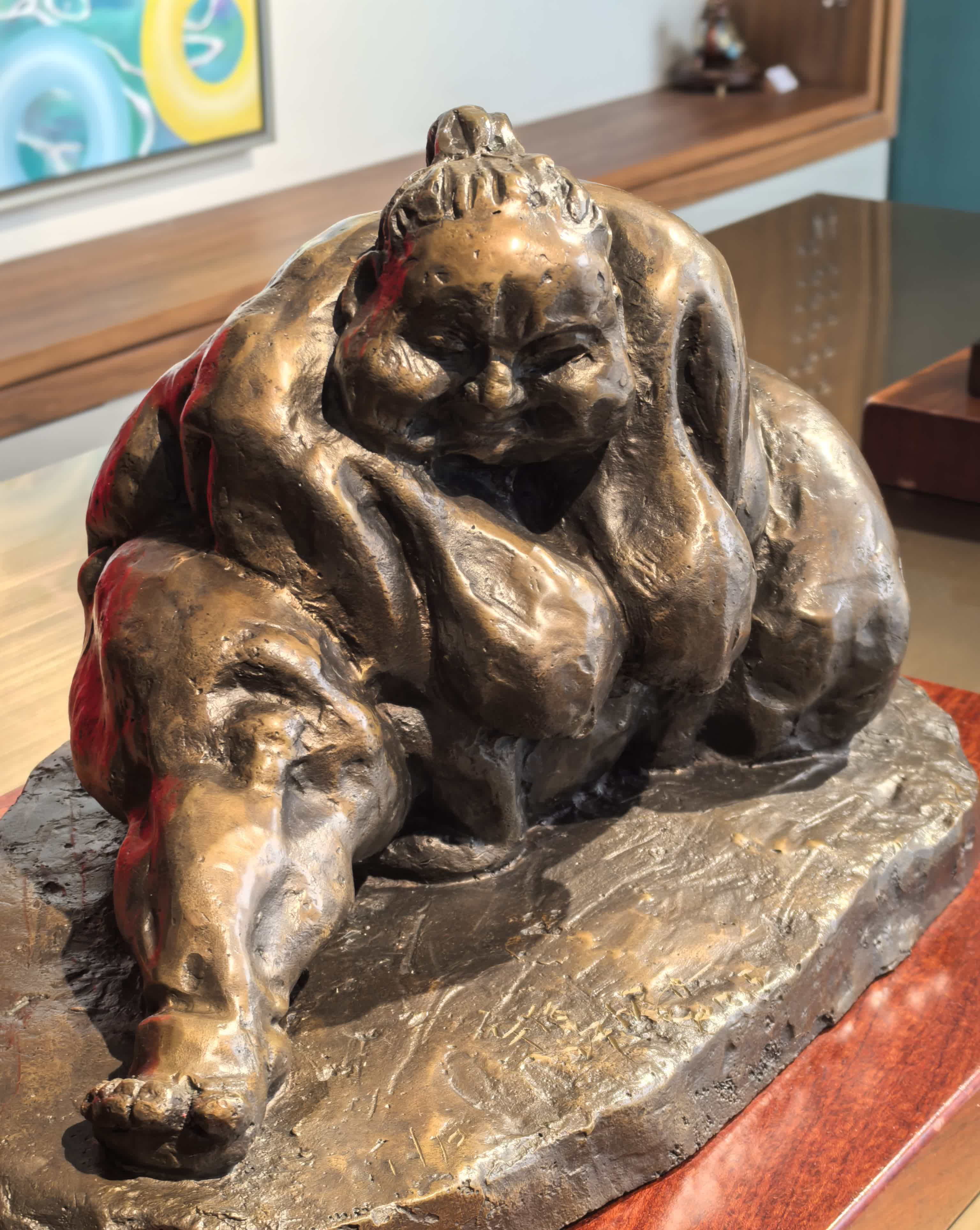許鴻飛的雕塑語言,是一場對古典美學的徹底反叛。他以「肥女」為載體,將西方現代雕塑的形制灌注東方世俗精神——馬約爾《地中海》的渾厚體量、羅丹《達那俄斯》的流動線條,經他之手蛻變為彌勒佛式的憨態與市井煙火氣的交融。在《迎風》中,肥碩身軀與單薄單車的荒誕對比,迸發出「失控的鬆弛感」;《貝茜》腳踏電動獨輪車的當代母親形象,讓洛杉磯推嬰兒車的年輕媽媽們忍俊不禁,爭相與之合影。