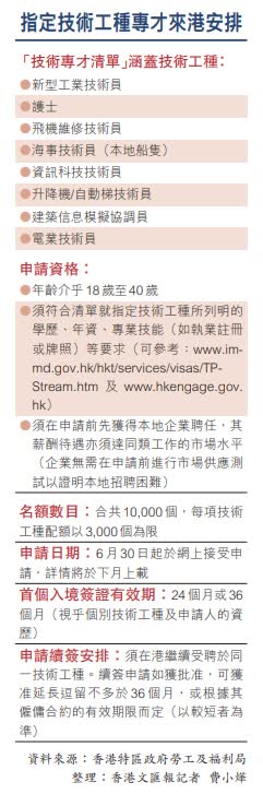 (香港文匯報記者 張弦)為應對香港人力尤其是熟練技工短缺的情況,香港特區政府昨日宣布,將於下月30日起在「一般就業政策」及「輸入內地人才計劃」下新增渠道,容許外來人士申請來港投身新型工業技術員、護士、飛機維修技術員、海事技術員(本地船隻)、資訊科技技術員、升降機/自動梯技術員、建築信息模擬協調員,以及電業技術員8項人力極短缺的技術工種。申請者須介乎18歲至40歲並符合「技術專才清單」列明資格的非學位專才,且獲本地企業聘任。新增渠道為期3年,共1萬個名額,每項技術工種配額以3,000個為限。政府發言人強調,新增渠道目的是希望吸引富經驗的非學位中層技術專才來港工作兼長遠發展,而非僅從事短期基層工作。