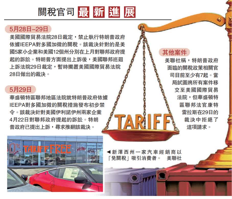 大公報綜合報道,美國國際貿易法院28日裁定,禁止執行特朗普政府依據《國際緊急經濟權力法》(IEEPA)對多國加徵的關稅。特朗普方面隨即向上級法院提出上訴,美國聯邦巡迴上訴法院29日裁定,暫時擱置美國國際貿易法院前一天作出的裁決。不到24小時內,美國兩級法院作出的反轉判決,可能給全球經濟注入更多不確定性。此外,美媒披露,特朗普的貿易團隊正為關稅政策尋找「B計劃」,以避免貿易談判因法律戰而中斷。