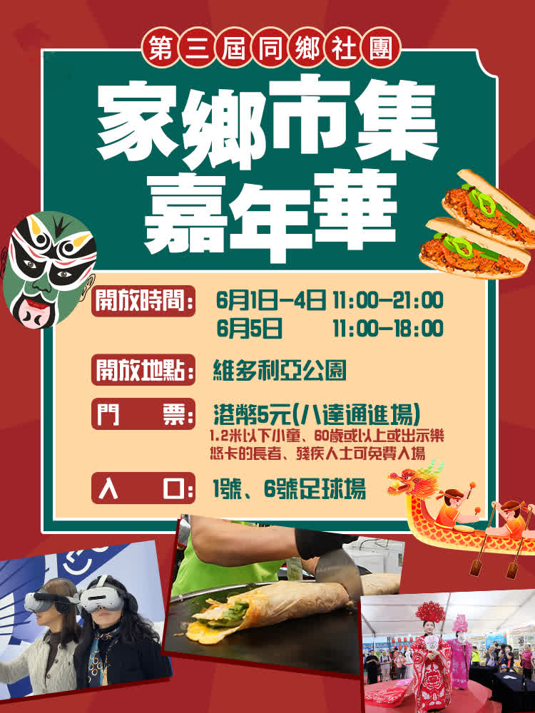 (大公文匯全媒體實習記者 張夢凡、許竣皓)這個周六(5月31日)適逢端午節,正是與家人團聚、共享傳統節日氛圍的好時機。而緊接其後,周日(6月1日)起,由全港30個省級同鄉社團聯合主辦的「家鄉市集嘉年華」將在維多利亞公園盛大開幕,活動持續5天(6月1日至5日),帶來近300個特色攤位、超過110萬件全國各地特產,以及近200場文藝表演,讓大家一站式體驗家鄉風味與文化魅力。