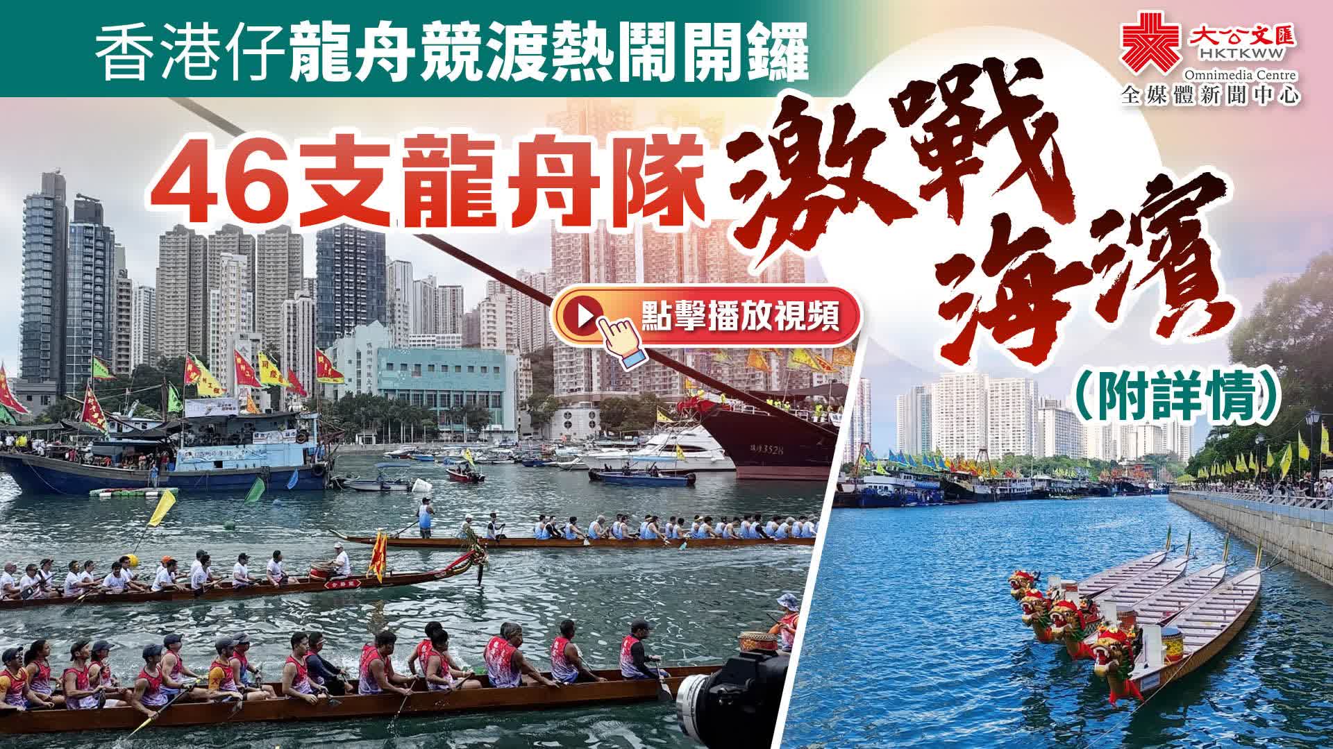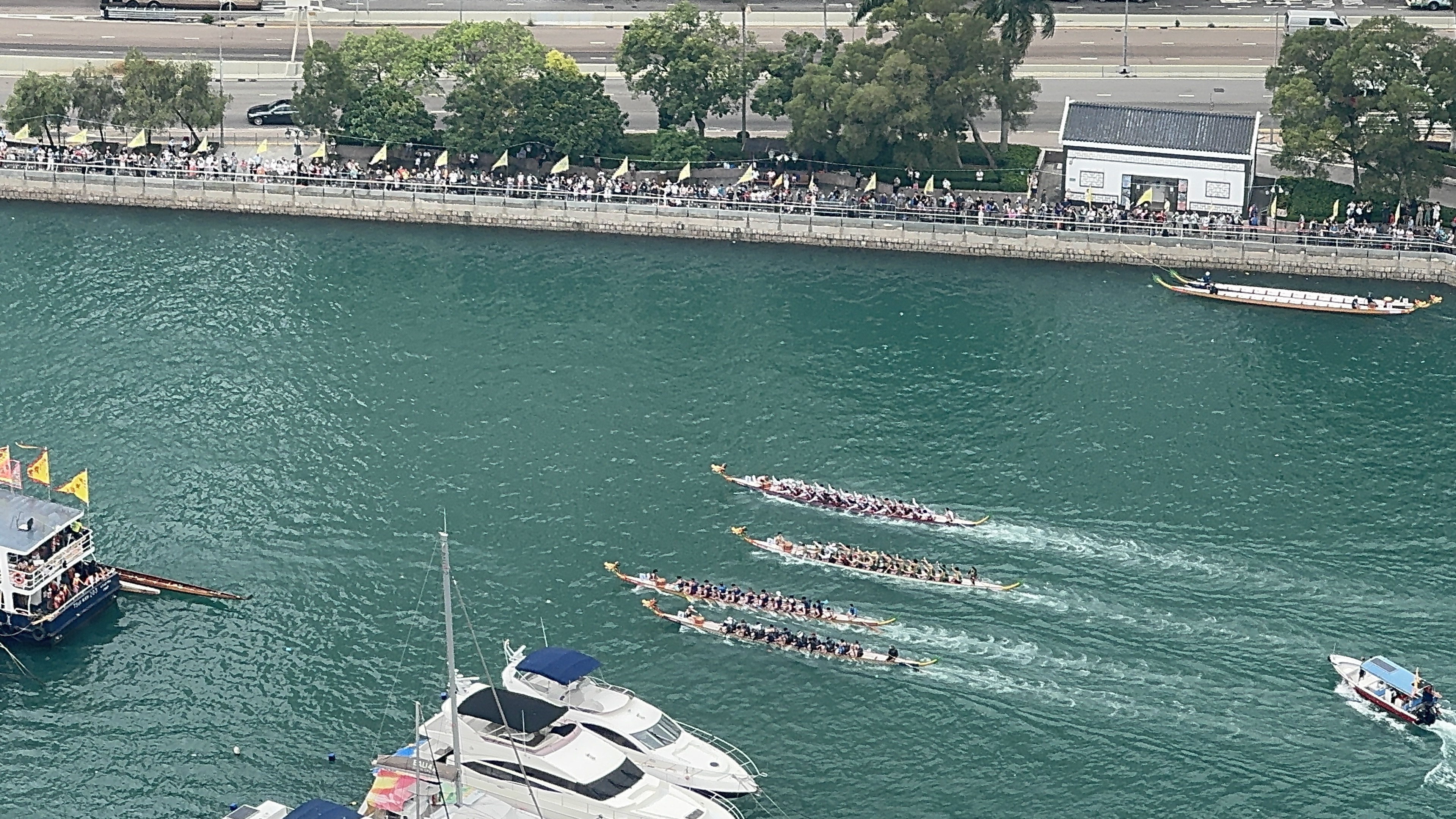 大公文匯全媒體報道,端午佳節重頭戲「龍舟競渡大賽」今日下午1時許在香港仔海濱擂響戰鼓。四艘龍舟在沿岸觀眾的吶喊助威聲中破浪疾馳,初段三艘賽艇齊頭並進難分伯仲,及至中程,靠海邊第三艘龍舟猛然發力脫穎而出,以明顯優勢佔據領先位置。現場熱鬧非凡,沿岸多是前來一睹龍舟賽事風采的觀眾。