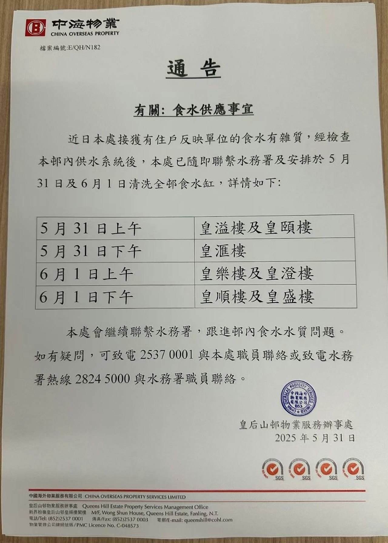 房屋署今日回應表示,該邨物業服務辦事處昨收到住戶反映單位食水有雜質,隨即派員跟進,並聯絡水務署提供協助。該邨有7座住宅大廈,近日屋邨沒有進行食水喉管或相關工程。水務署已於昨日派員到場了解,並從皇后山邨各座水缸抽取樣本化驗,結果顯示水質安全;亦已安排沖洗供應皇后山邨的政府喉管,經檢視後並無異樣。皇后山邨物業服務辦事處已按照水務署的建議,安排今明兩天清洗全邨7座住宅大廈及皇后山商場的食水缸,並已張貼通告提醒居民,辦事處會繼續和水務署保持緊密聯繫。