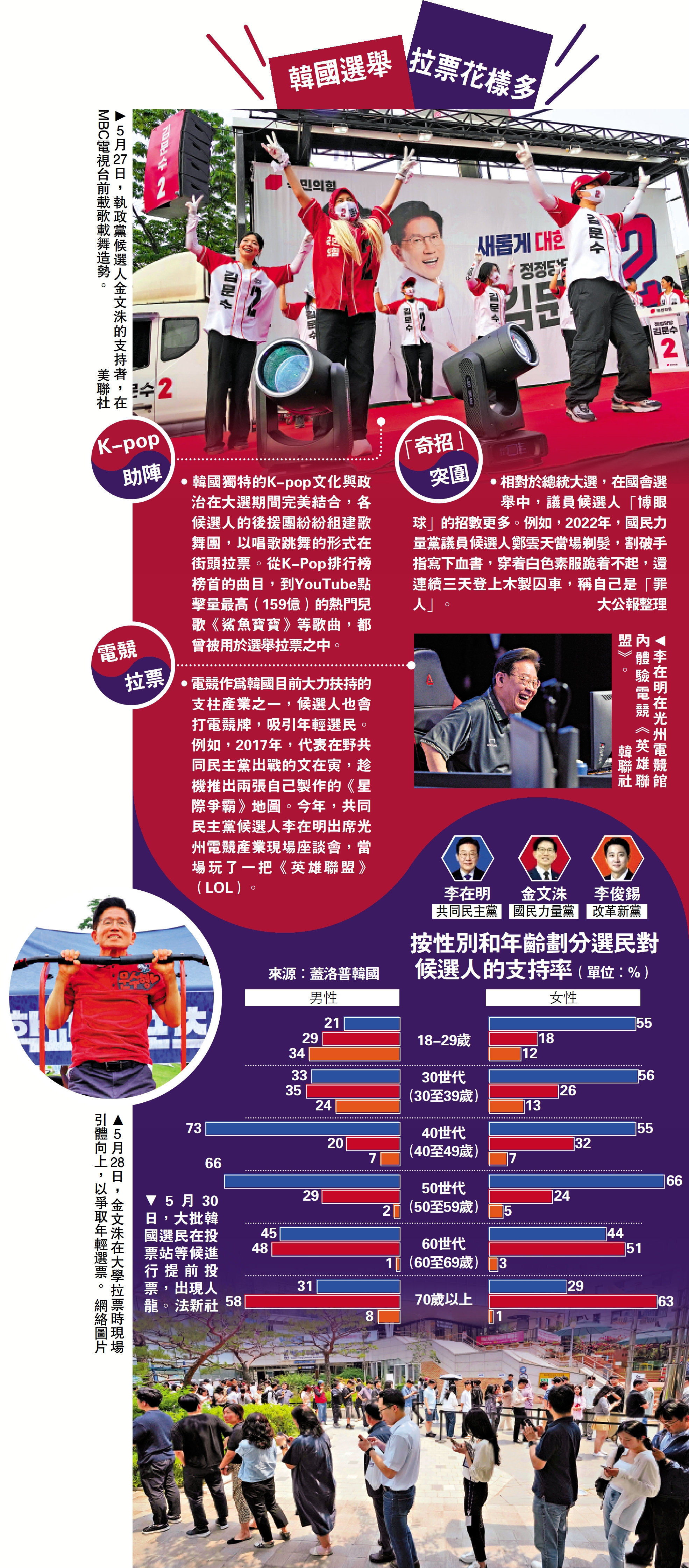 (大公報記者 桂茹雲 綜合報道)韓國總統選舉將於6月3日舉行。截至當地時間5月30日,為期兩天的提前投票結束,最終投票率達34.74%,創下史上第二高。自選戰開始,各候選人使出渾身解數爭取選票,體驗電子競技、當眾做引體向上引發網絡熱議,成為拉攏年輕選民的招數,甚至上演「玄學拉票」。已完成提前投票的韓國選民Yuna受訪時表示,隨着選戰白熱化,韓國社會依舊嚴重分裂,新總統上任後面臨艱巨挑戰。