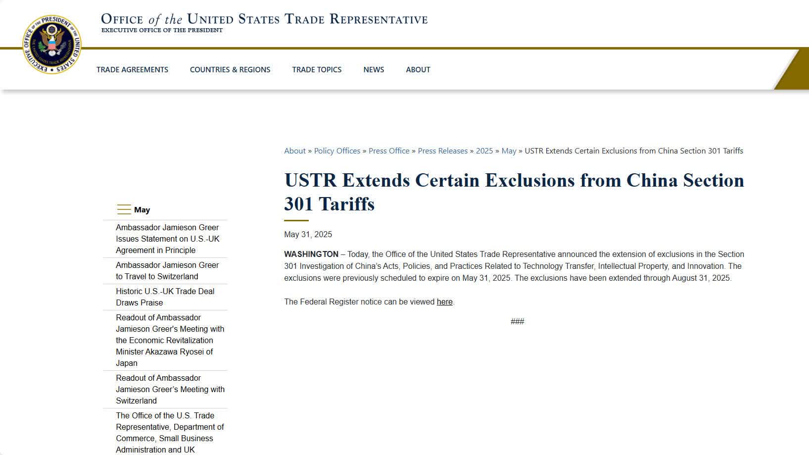 據中新網報道,美國貿易代表辦公室6月1日宣布,延長對中國在技術轉讓、知識產權和創新方面的行為、政策及做法的301調查中的豁免期限。豁免期限原定於2025年5月31日到期,現已延長至2025年8月31日。