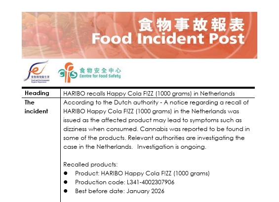 大公文匯全媒體報道,德國糖果品牌Haribo一款可樂味軟糖在荷蘭被驗出含有大麻成分,有人進食後頭暈不適,當地下令全面回收。特區政府稱,目前暫未接獲市民食用後引致不適的報告,惟審慎起見已通知業界暫時將該品牌軟糖下架。