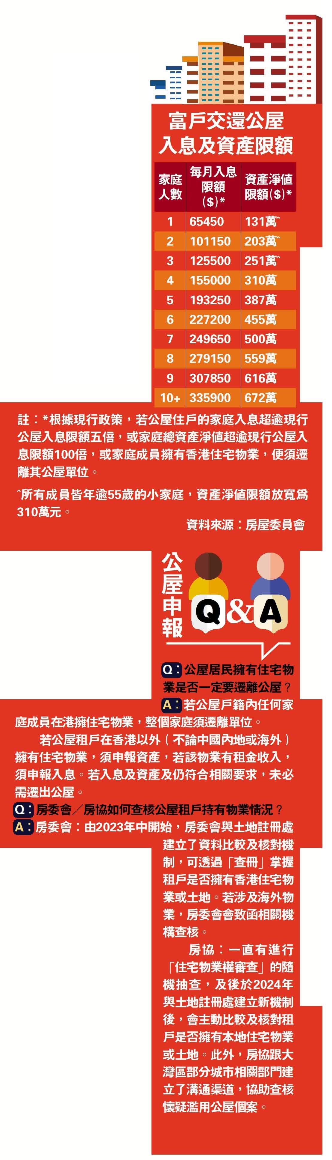 根據現行政策,公屋家庭入息超逾現行公屋入息限額五倍,或家庭總資產淨值超逾現行公屋入息限額100倍,須遷出公屋單位(詳見表)。若作虛假陳述,罪成最高可被罰5萬元及監禁6個月;若忽略提供申報表指明的詳情,最高罰款2.5萬元及監禁3個月。