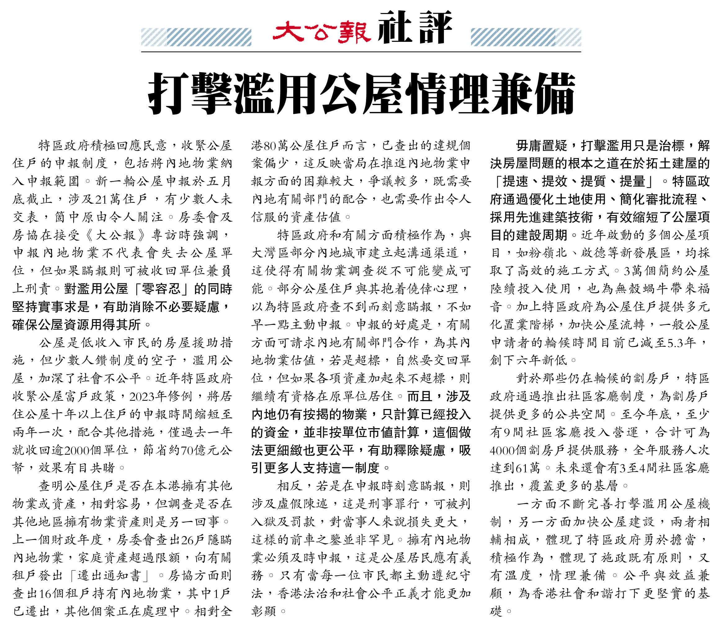 一方面不斷完善打擊濫用公屋機制,另一方面加快公屋建設,兩者相輔相成,體現了特區政府勇於擔當,積極作為,體現了施政既有原則,又有溫度,情理兼備。公平與效益兼顧,為香港社會和諧打下更堅實的基礎。