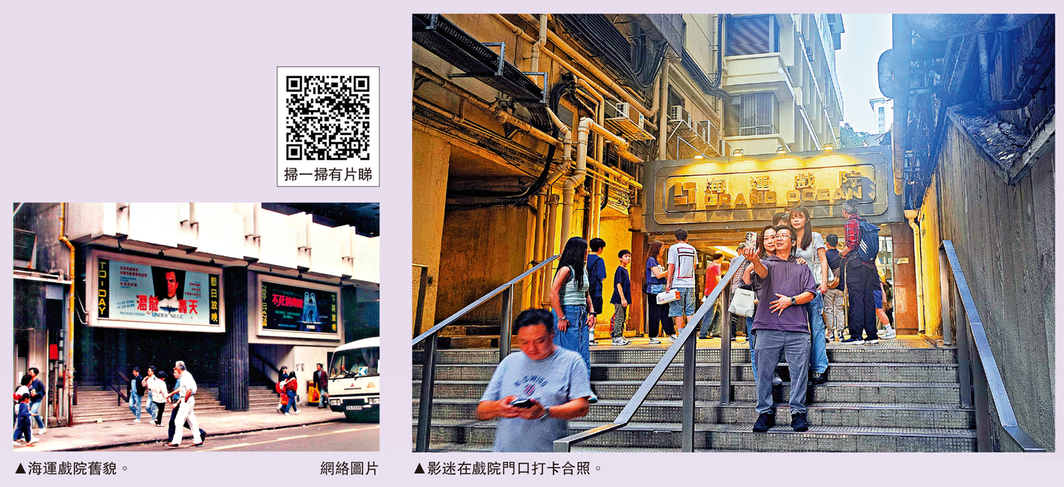 (大公報記者 徐小惠〈文、圖〉)位於尖沙咀廣東道的嘉禾海運戲院昨日最後營業,歷經56年歷史於今日正式結業。海運戲院作為尖沙咀地標戲院,陪伴一代又一代影迷,見證不同電影年代的時光流轉。昨日一整天,戲院都擠滿前來打卡紀念和觀影的戲迷,下午五時半開始,戲院連續放映三場「嘉禾經典盲盒場」,以答謝戲迷多年支持,與觀眾一同重溫經典佳作。