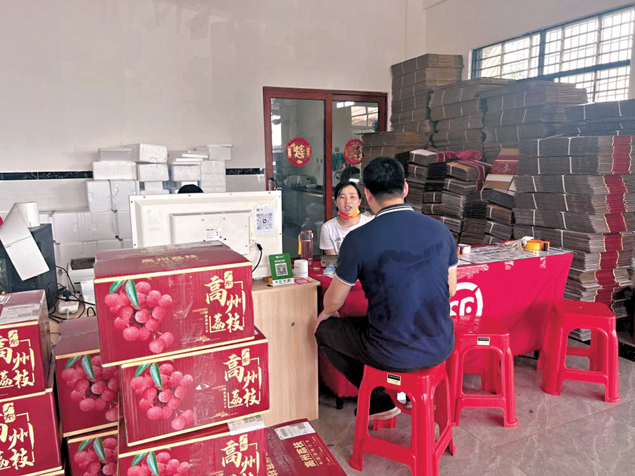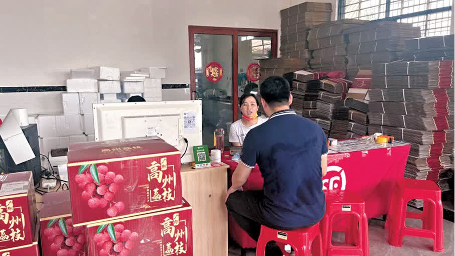 在茂名市區文光街,隨處可見快遞員協同水果店工人忙着將荔枝打包的場景,電商生意紅火。一間水果店的店主黃女士表示,當地電商早已提前做好今年的訂單銷售,茂名荔枝甫一上市,快遞公司隨即上門,到水果店打包發貨,中國各大一線城市都能在24小時內到貨。