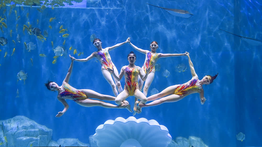 同步煥新的水舞秀以浪漫唯美的原創水下高難度芭蕾舞蹈及形體藝術展現,引發陣陣驚嘆,成為遊客鏡頭追逐的焦點。