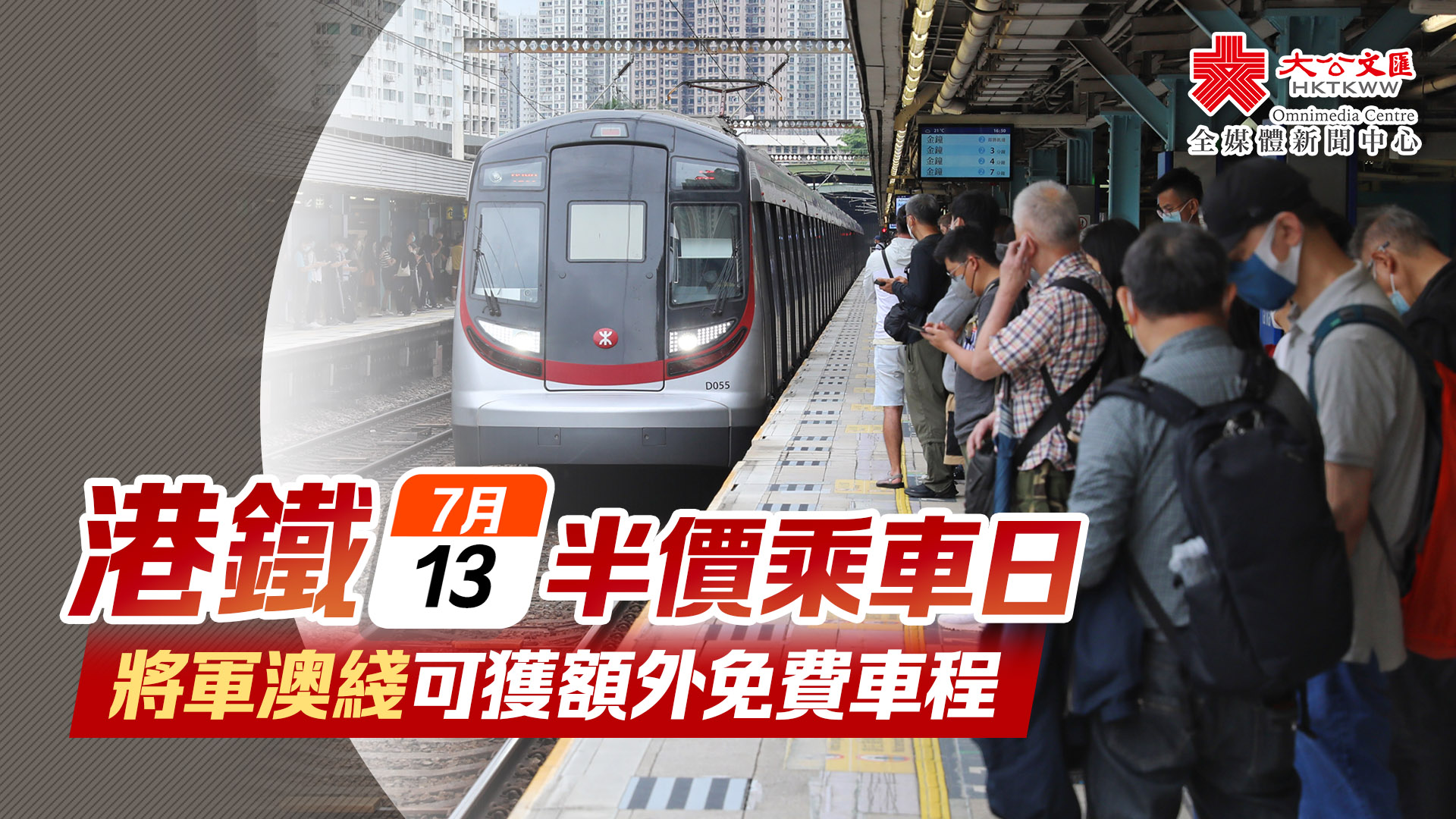 公司早前公布根據票價調整機制下的「服務表現回贈」安排,就5月22日將軍澳綫事故撥出1920萬元,連同早前此賬戶內的累積款項,公司將安排於7月13日推出一天「感謝日」。當天,乘客使用八達通乘搭港鐵、輕鐵及行走新界西北路綫的港鐵巴士,或以車票二維碼乘搭重鐵網絡車程,均可以半價乘車,涵蓋包括來往東鐵綫羅湖及落馬洲站的過境車程,並可與轉乘優惠、特惠站以及全月通連接車程七五折優惠同時使用。