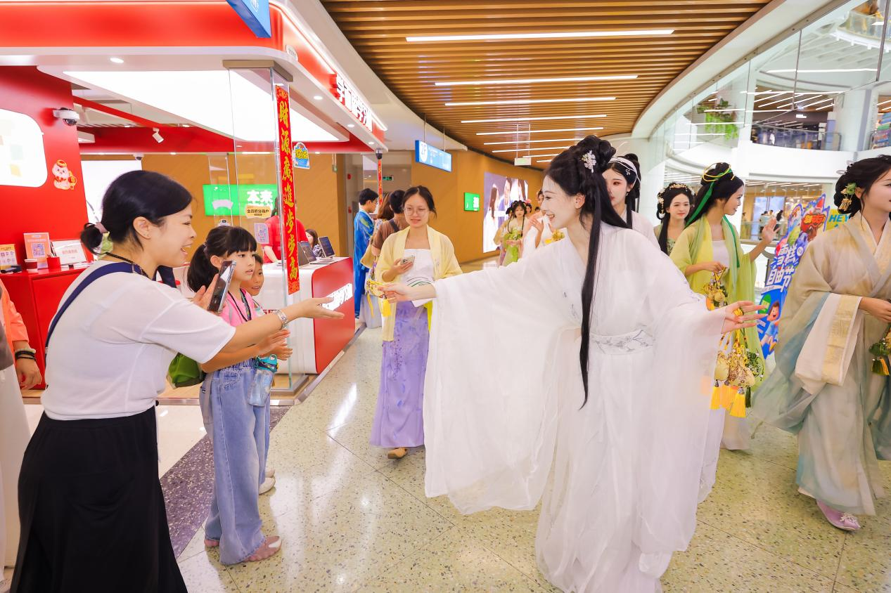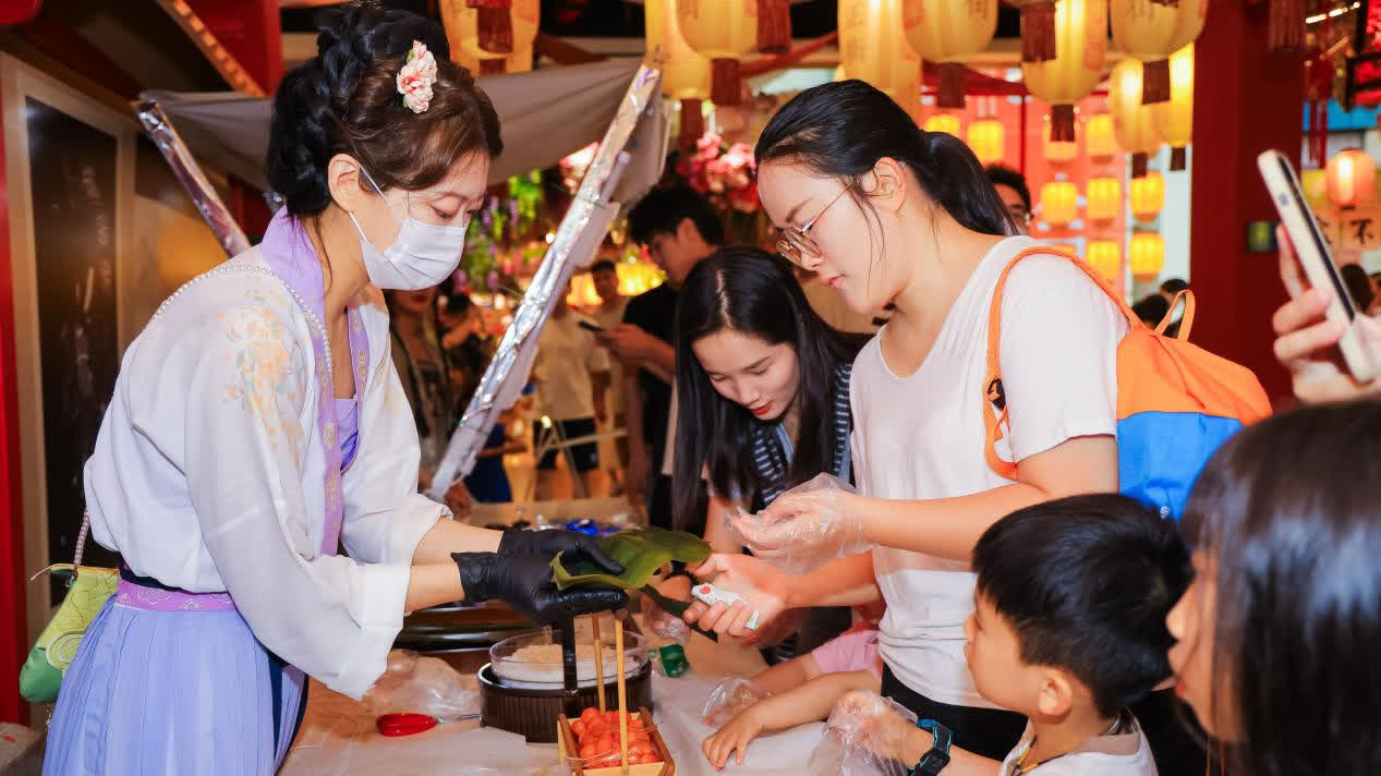 在廣州多個商圈都打出了傳統民俗「活化」牌,吸引街坊消費。在廣州天河正佳廣場,就以「同船渡·粵韻廣州」主題,呈現水下舞秀、漢服快閃、非遺體驗及親子互動等豐富內容。其中,臨近高考,「狀元高粽」包粽互動最受歡迎,遊客可親手包粽並獲頒「粽子身份證」。現場還有以白蛇傳為主題的漢服巡遊。廣州的陳女士帶着女兒體驗後表示:「孩子第一次接觸漢服文化,這次活動也讓她對端午習俗產生了濃厚的興趣。」
