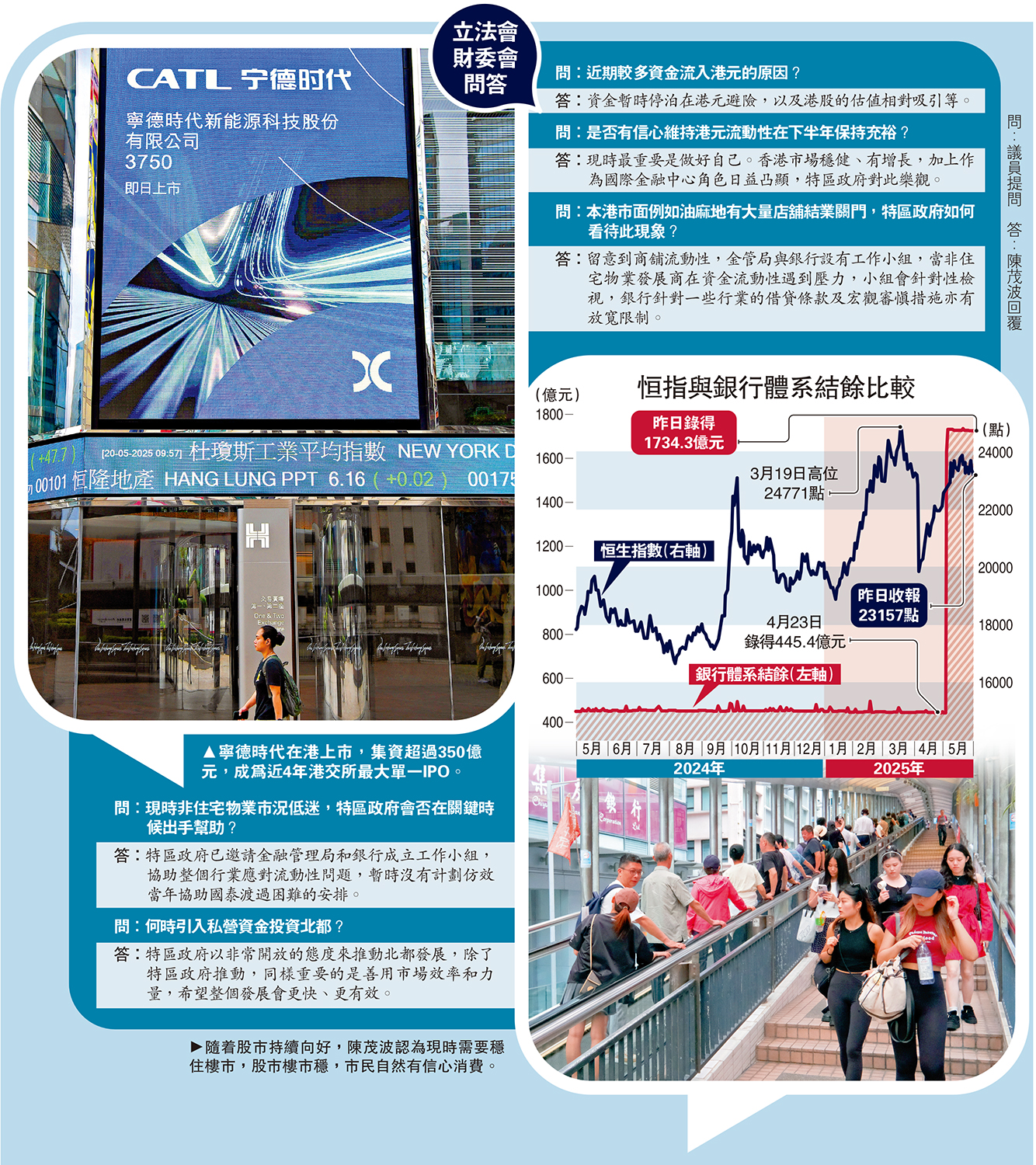 立法會昨日舉行財經事務委員會會議,陳茂波匯報本港最新的經濟狀況。他表示5月初港元匯率觸發聯繫匯率制度下的強方兌換保證,香港金融管理局四度入市,合共向市場注入約1300億港元流動性。截至5月30日,香港銀行體系總結餘升至1734億元,顯著高於去年年底的448億元。銀行總存款額於今年首四個月上升4.1%,當中港元存款上升4.4%,反映資金流入香港銀行體系。