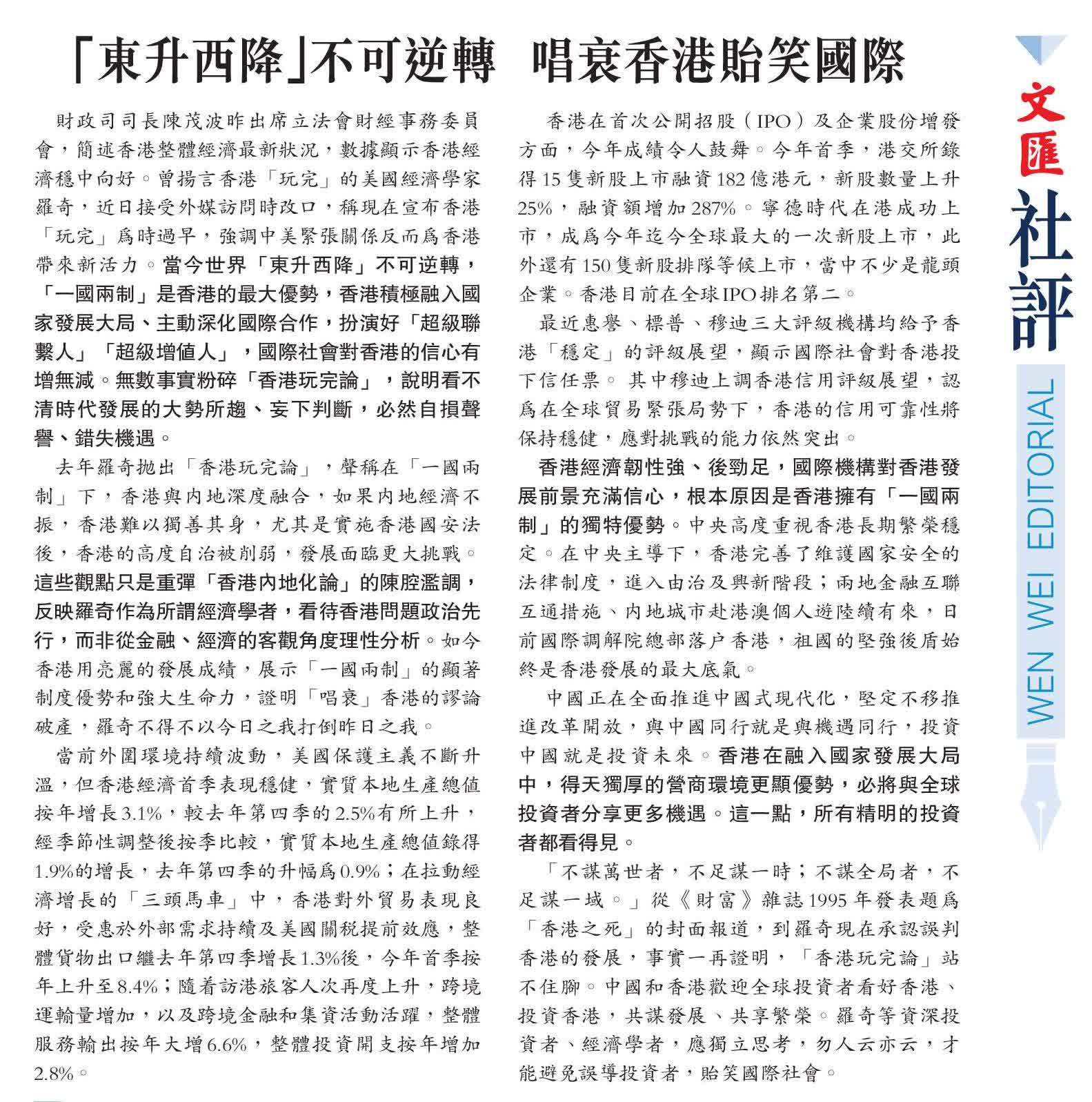財政司司長陳茂波昨出席立法會財經事務委員會,簡述香港整體經濟最新狀況,數據顯示香港經濟穩中向好。曾揚言香港「玩完」的美國經濟學家羅奇,近日接受外媒訪問時改口,稱現在宣布香港「玩完」為時過早,強調中美緊張關係反而為香港帶來新活力。當今世界「東升西降」不可逆轉,「一國兩制」是香港的最大優勢,香港積極融入國家發展大局、主動深化國際合作,扮演好「超級聯繫人」「超級增值人」,國際社會對香港的信心有增無減。無數事實粉碎「香港玩完論」,說明看不清時代發展的大勢所趨、妄下判斷,必然自損聲譽、錯失機遇。