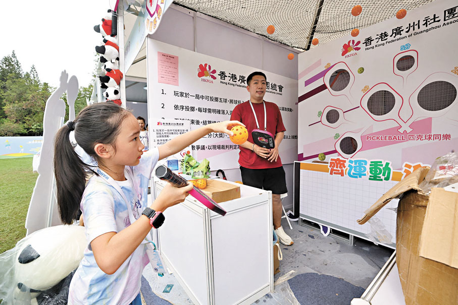 (香港文匯報 記者 蔡學怡、王俊傑)今年的家鄉市集嘉年華除了有各地特色的美食及文化產品展銷外,還多了一樣特殊的安排,就是運動競技項目。因應粵港澳三地共同承辦的第十五屆全運會將於今年11月舉行,主辦方特意在維園草地區設立了以「動感全運 樂聚維園」為主題的互動體驗區。區域內設有35個運動體驗攤位及5個互動區,更有來自新疆的滑雪運動員在場示範及教授滑雪技巧,令人們在品嘗家鄉美食之餘,還能參與運動互動遊戲,可謂是今年活動中吸睛的一大亮點。有參與多個競技項目的市民說,體驗攤位內容十分有趣,且獎品類別多元,令他們盡興而歸。而滑雪教練亦指出,連日來都有不少市民與他交流或請教滑雪技巧,他認為很多香港市民對於滑雪也很感興趣。