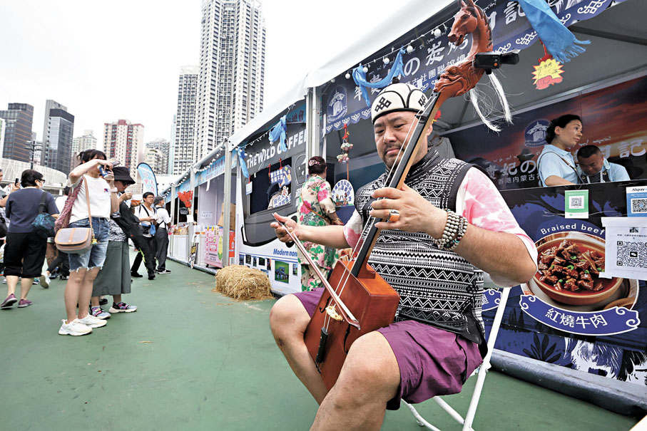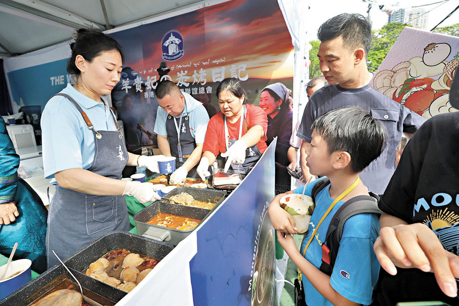 攤位旁還有蒙古族歌手現場獻唱,彈奏着內蒙傳統的馬頭琴樂器,其嘹亮的歌聲與美食香氣交織,讓人恍若置身遼闊的內蒙古草原。包豔麗直言:「儘管內蒙和香港距離遙遠,但我們希望通過現場準備的美食、音樂和民族服飾,讓市民感受到濃郁的內蒙風情。」