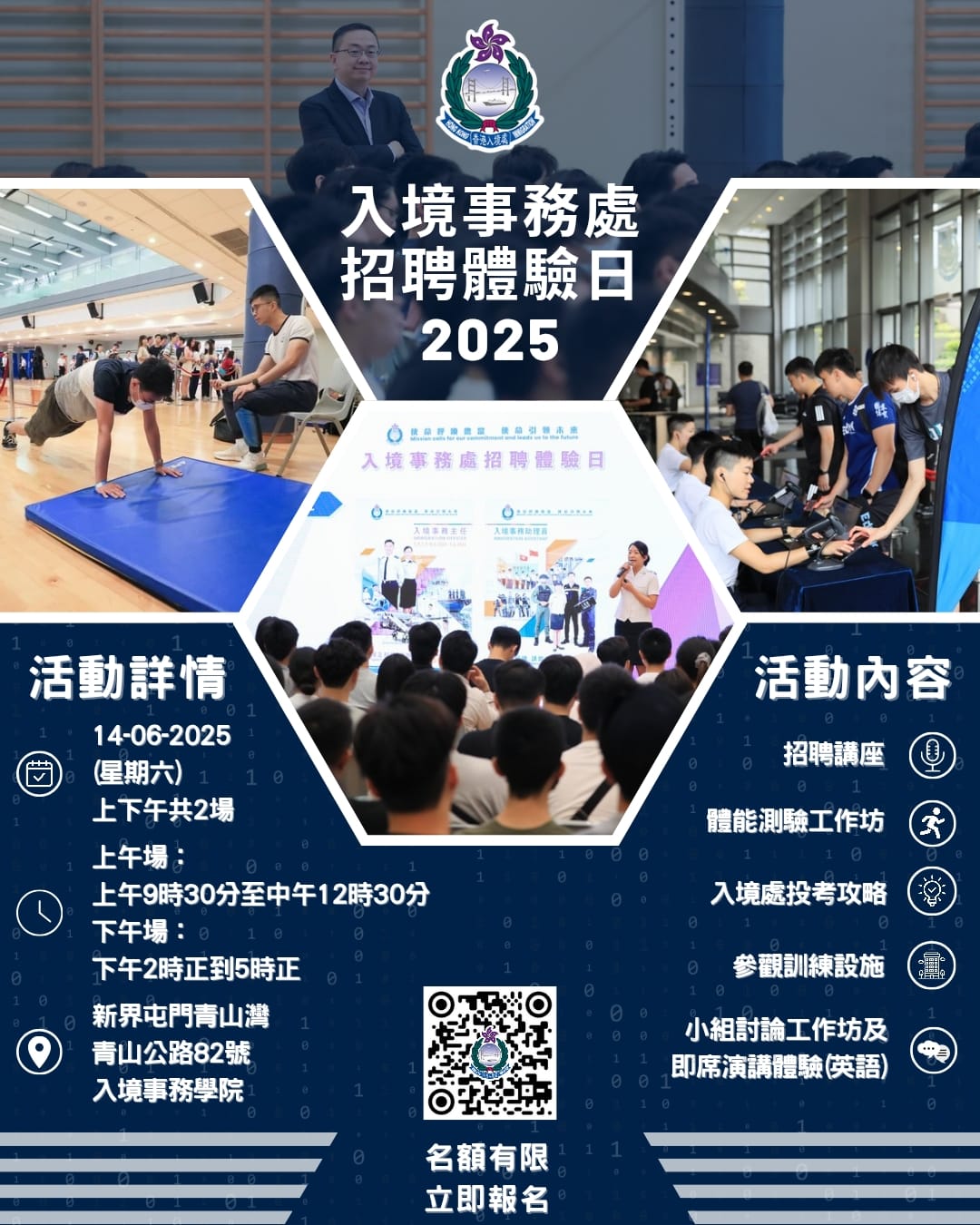 體驗日當天除了有招聘組的同事為大家講解投考的流程,還會分享投考小提示。我們還設有體能測驗工作坊,解構動作要點,大家還可以現場試試身手!此外,我們也會有小組討論工作坊及即席演講體驗,和大家一同拆解即席演講和小組討論的常犯錯誤,讓大家為投考入境處作更好的準備!
