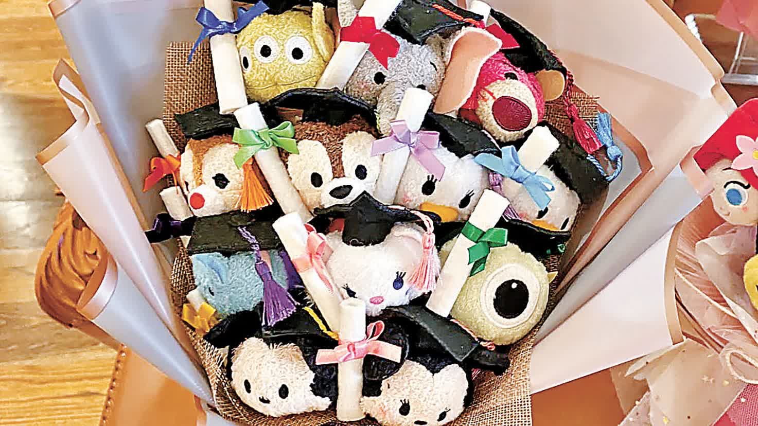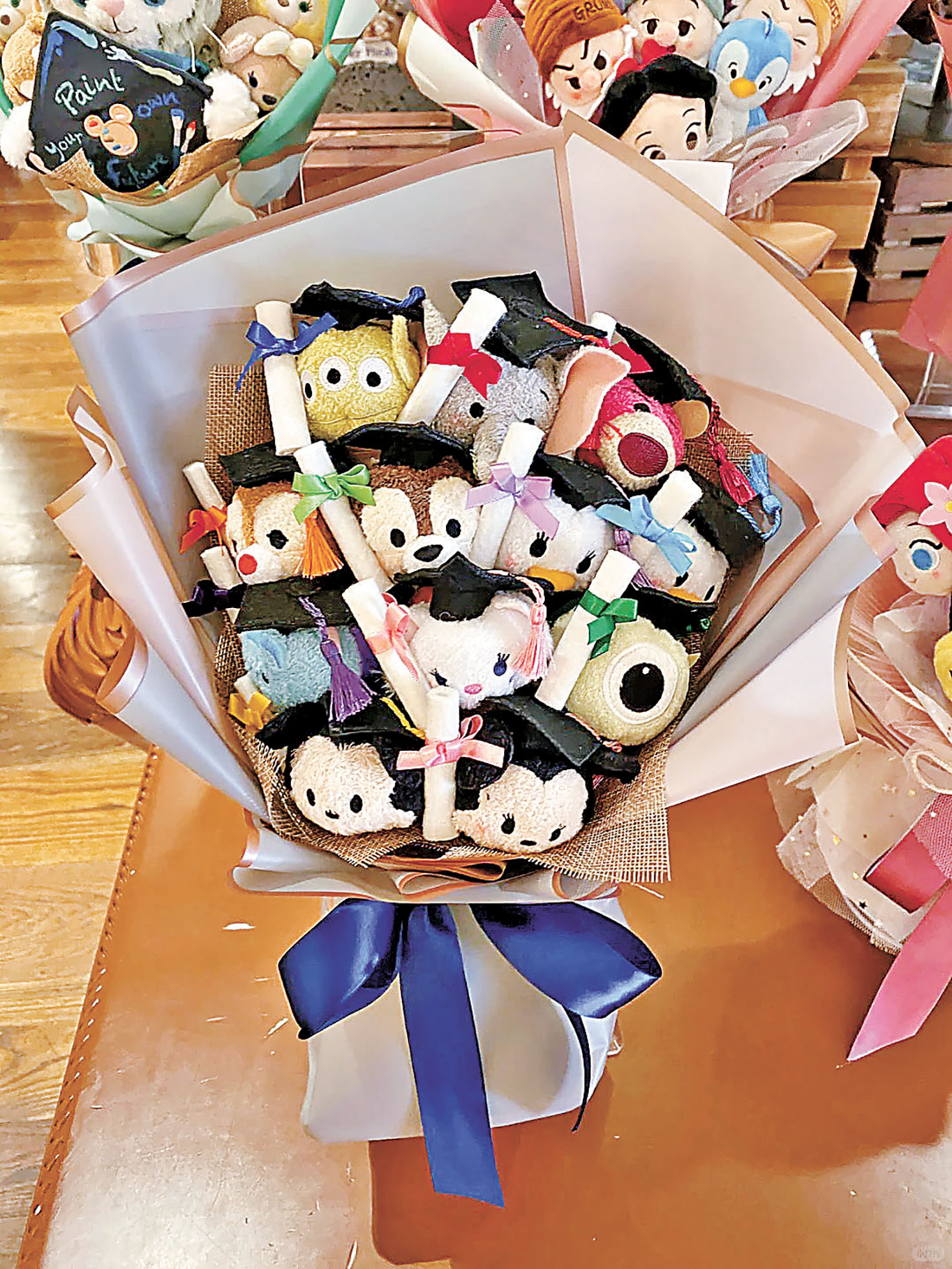 畢業季是人生最重要的時刻之一,怎能少得了陪伴港人長大的迪士尼老友們。恰逢畢業季,香港迪士尼商店內有許多身着畢業服飾的公仔登場,除了米奇、米妮、小熊維尼這些老朋友,還少不了玲娜貝兒和達菲,以及最近因為真人版電影上映忙得不可開交的大明星史迪奇。除了特殊造型的公仔沒法換裝,標準體形的公仔可以自行選擇畢業服飾搭配,打造專屬於你的畢業公仔。此外,還有毛公仔畢業花束,可以選擇購買園方搭配好的,也可以自己挑選小公仔DIY。小公仔只有一個毛絨絨的腦袋,但是集齊畢業帽和證書兩大元素,小巧精緻。12個小公仔即可包成一束,勢要打造最可愛的畢業花束。不過請工作人員打包需付額外手工費,想省錢可以學習自己包花束。