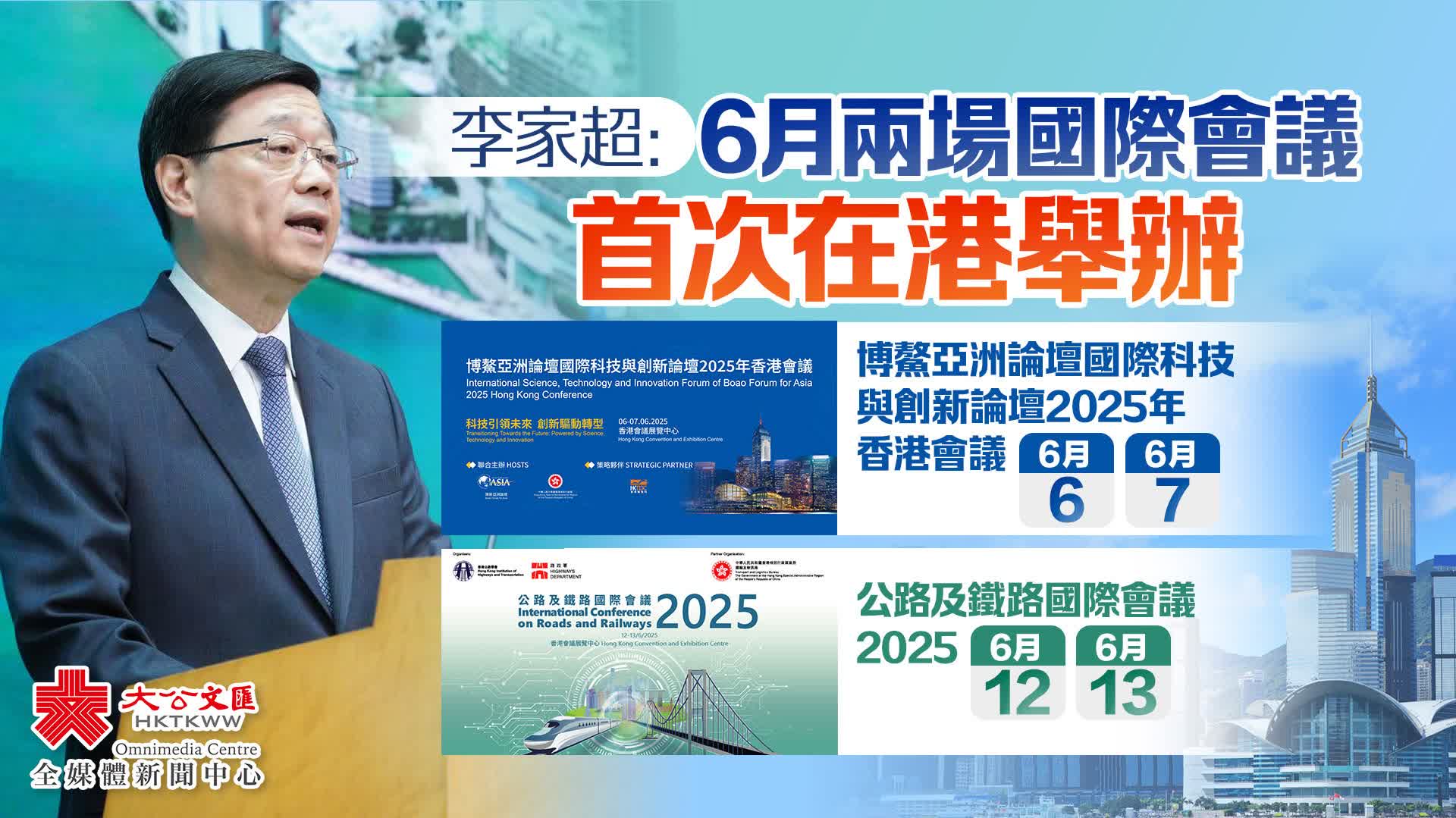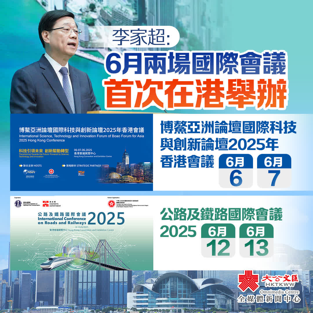 大公文匯全媒體報道,行政長官李家超今日(6月3日)出席行政會議前見記者。李家超宣布,在6月,香港將主辦兩場首次在香港舉行的重要國際會議。第一場是博鰲亞洲論壇國際科技與創新論壇2025年香港會議,第二場是公路及鐵路國際會議2025,分別將於6月6日至7日及6月12日至13日舉行。