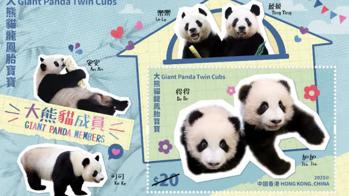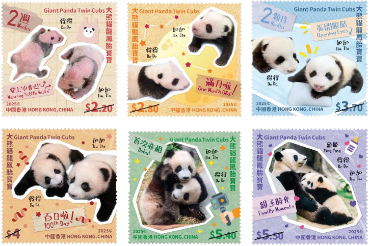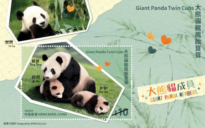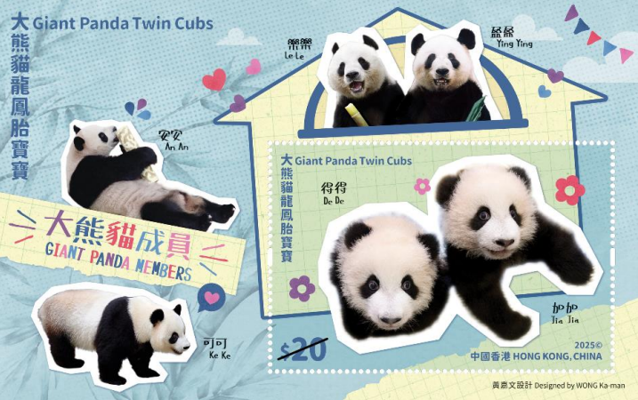 中央政府於2007年贈送香港一對大熊貓「盈盈」和「樂樂」,於2024年8月15日誕下一對龍鳳胎寶寶「加加」和「得得」。廣大市民非常喜愛這對大熊貓龍鳳胎,並時刻關注牠們的成長。香港郵政將以「大熊貓龍鳳胎寶寶」為題發行特別郵票,展示「加加」和「得得」在不同階段的生活點滴,見證牠們的成長旅程。