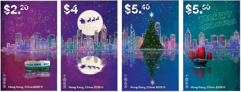 香港郵政將以「聖誕郵票V」為題發行特別郵票,郵票以維港夜景為背景,在星空下呈現各式各樣的聖誕元素和節日的歡樂。