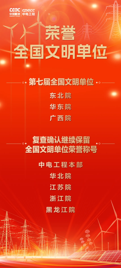 本次評選中,中電工程華北院、江蘇院、浙江院、黑龍江院4家單位也通過複查驗收,繼續保留全國文明單位榮譽稱號。中電工程東北院、華東院、廣西院3家單位通過認定命名,被授予第七屆全國文明單位稱號。至此,中電工程全國文明單位矩陣擴展至8家。