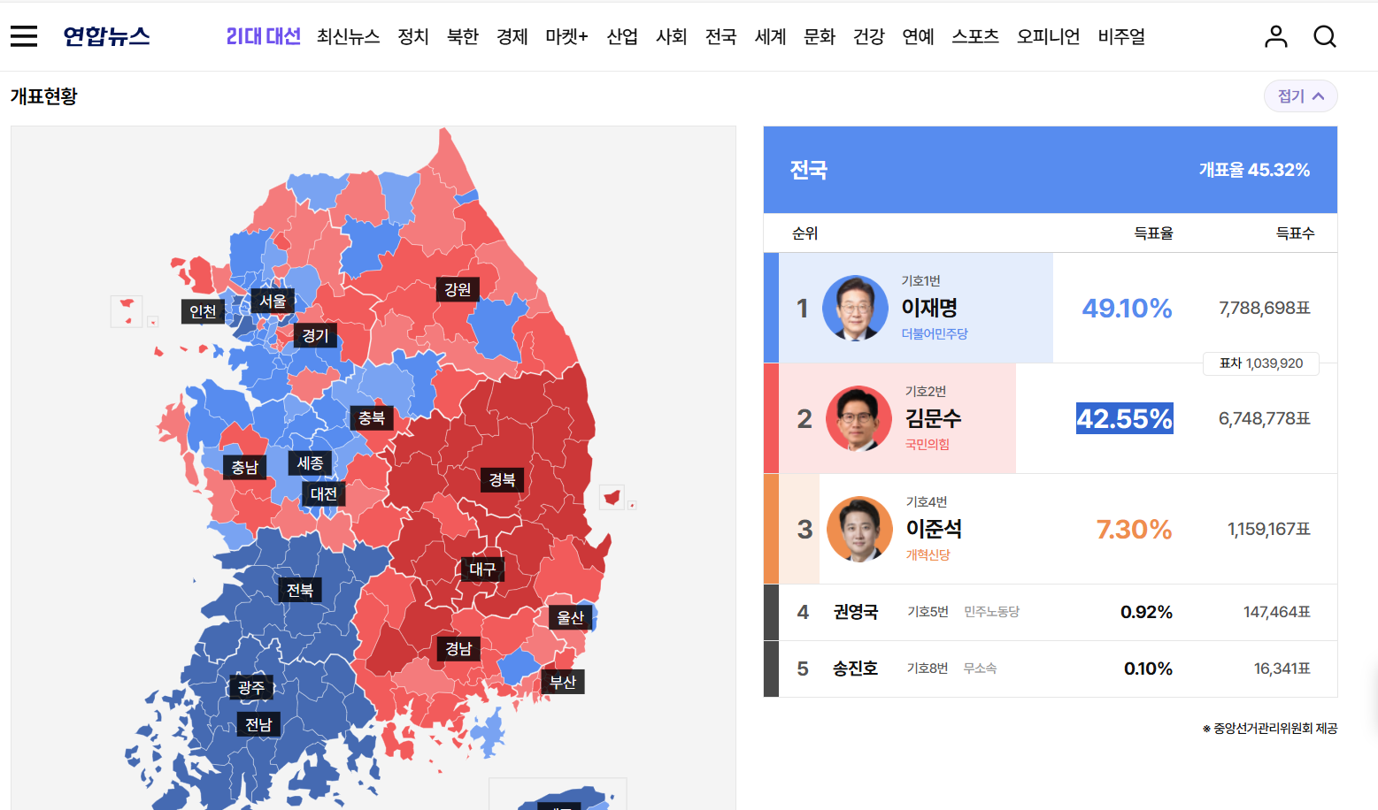 據韓聯社報道,目前韓國全國開票率45.32%,李在明以7,788,698票、佔比49.10%領先;金文洙以6,748,778票、佔比42.55%位於第二。韓聯社指,大選結果「幾成定局」。
