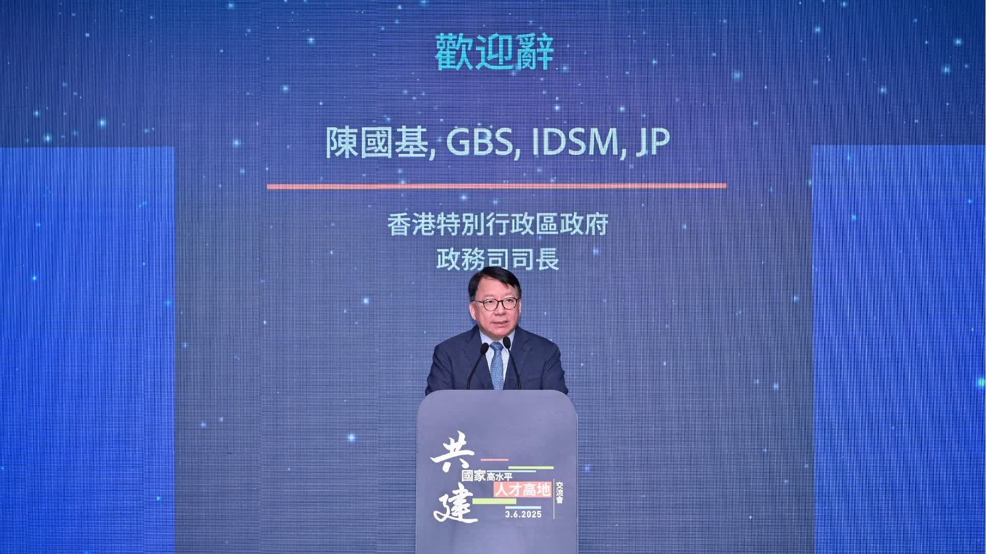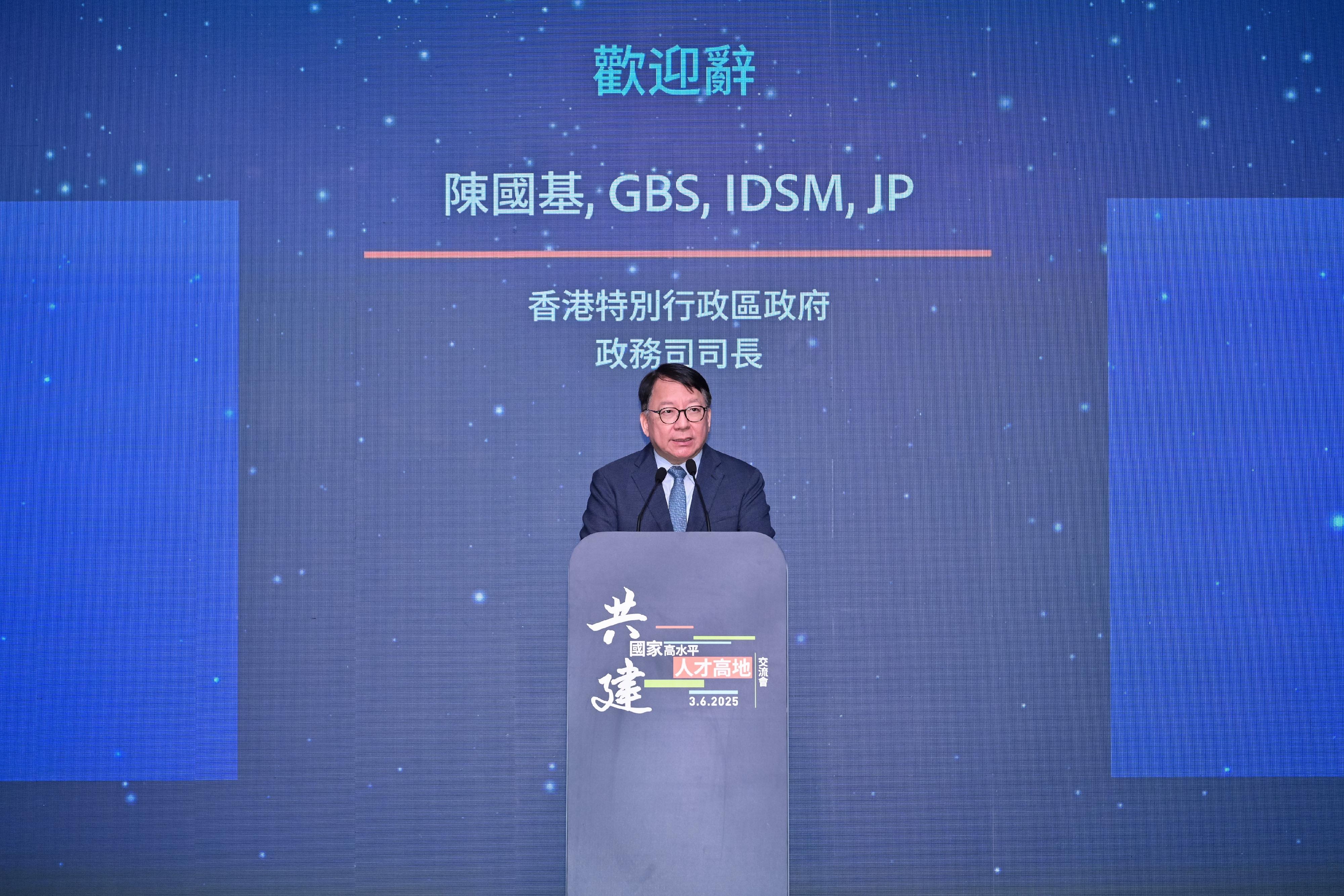 政務司司長陳國基致歡迎辭時表示,教育、科技及人才是發展新質生產力、強化高質量發展的重要基礎,特區政府設立的教育、科技和人才委員會對準「八大中心」戰略定位的人力需求,統籌推進教育、科技和人才三者一體化融合發展,打造香港為國際高端人才集聚高地。