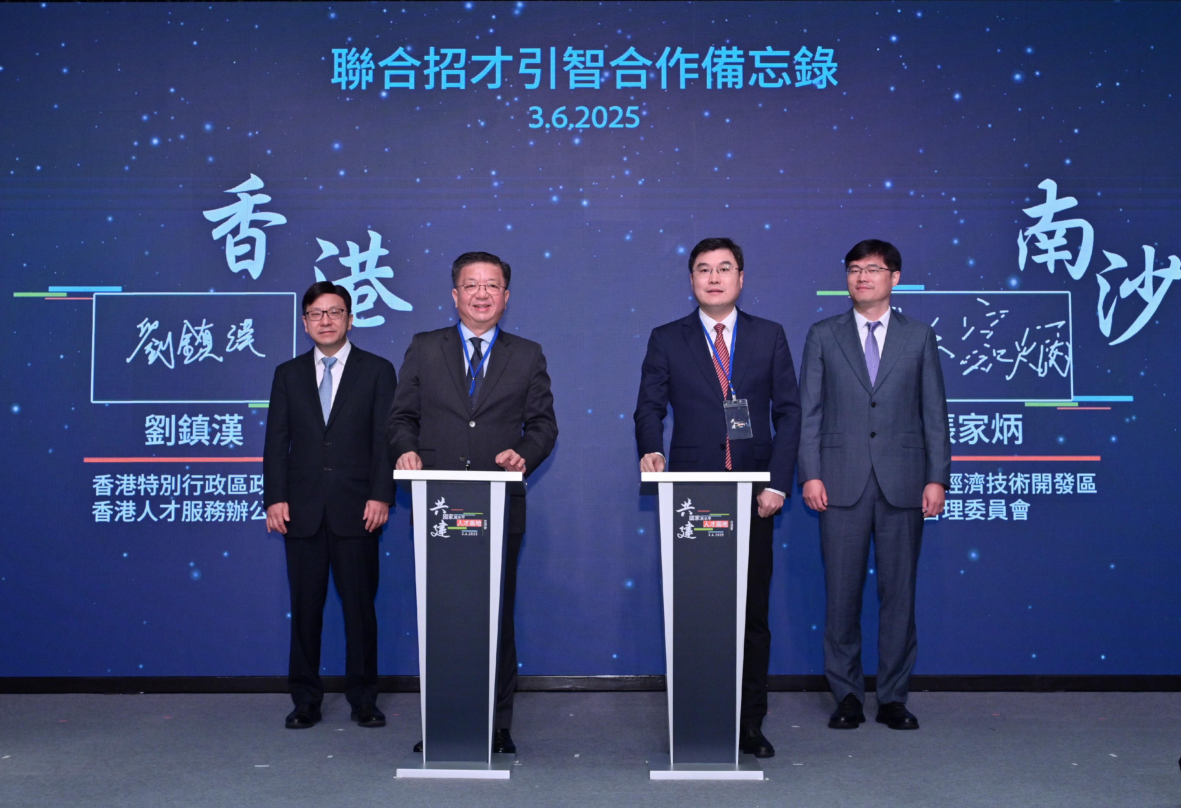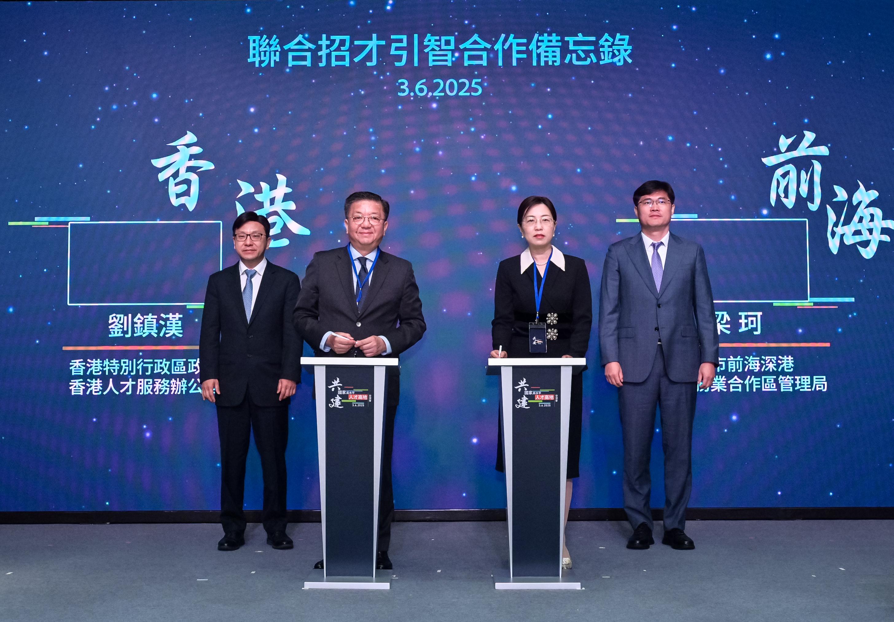 在孫玉菡見證下,香港人才服務辦公室總監劉鎮漢分別與深圳市前海合作區黨工委副書記梁珂和廣州市南沙區委常委、區委人才工作領導小組辦公室主任張家炳簽署合作備忘錄,深化香港與兩地在人才引進、服務、就業及發展等領域的合作。