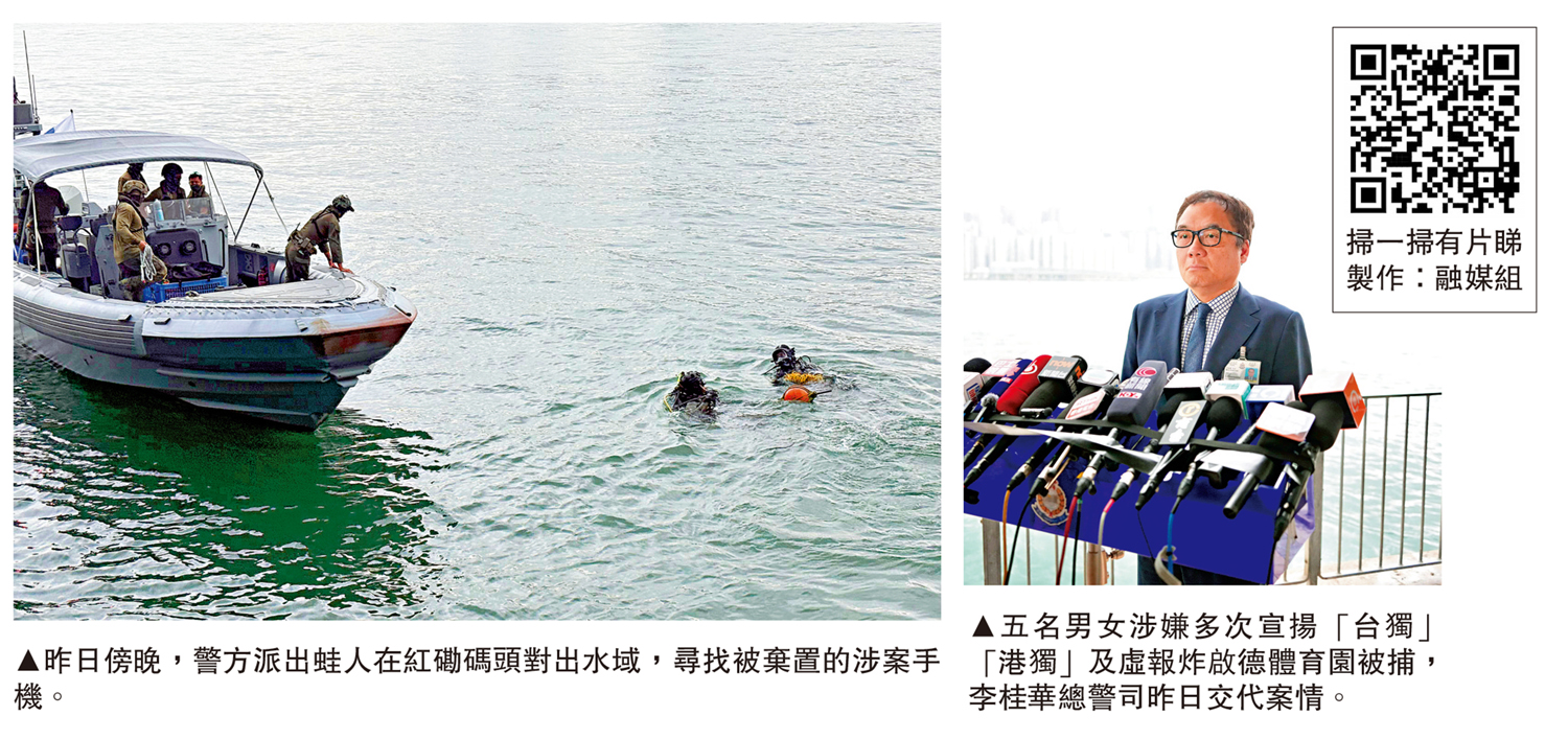 (大公報 記者 盛德文)懷疑「港獨」分子不斷發布炸彈恐嚇訊息,香港警務處國家安全處迅速行動,前日(2日)拘捕1男4女,他們涉嫌向警方報案聲稱會炸毀中央駐港機構和啟德體育園,又多次宣揚「港獨」、「台獨」等訊息。被捕的5人年齡由24至38歲,他們涉嫌「串謀恐怖活動」,被捕男子正被扣留調查,另4名女子獲准保釋候查。