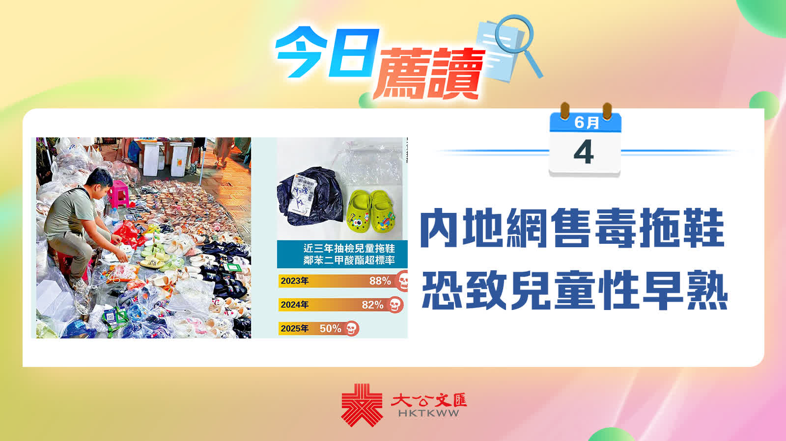 大公報新聞綜述。有環保公益組織對多個電商平台銷量前十兒童涼拖鞋進行檢測,發現抽檢整體鄰苯二甲酸酯超標率為50%。鄰苯為廉價塑化劑,可通過皮膚接觸等途徑進入人體,長期暴露可能導致兒童發育異常,性早熟、生殖系統發育受損等。點擊閱讀詳情>>