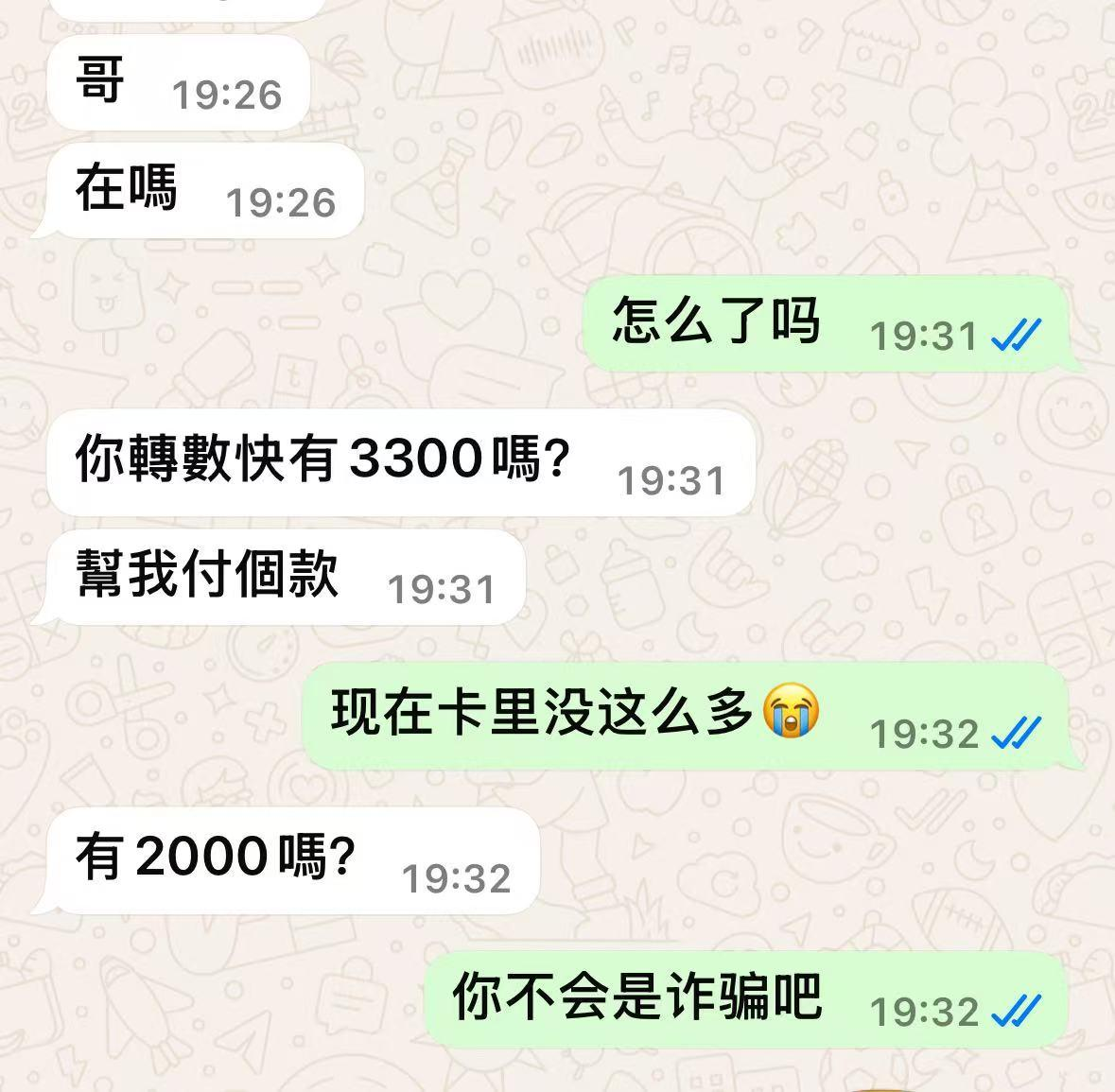 5月30日晚上,剛下班的港漂打工仔小新(化名)突然收到一條來自WhatsApp「好友」的消息。對方開口便稱「哥,在嗎?」,緊接着提出要求「你轉數快有3300嗎?幫我付個款」。