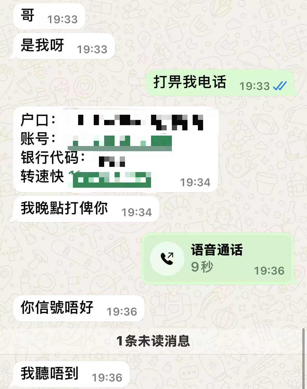 此時,小新疑竇驟起,要求對方打電話驗明正身。毛骨悚然的是,事主在自己的通訊錄中竟遍尋不到這位好友的電話號碼!只得通過WhatsApp的語音通話聯繫對方。通話僅持續9秒即被掛斷,小新表示:「期間什麼也聽不見,對方則聲稱『你信號唔好,我聽唔到』。」