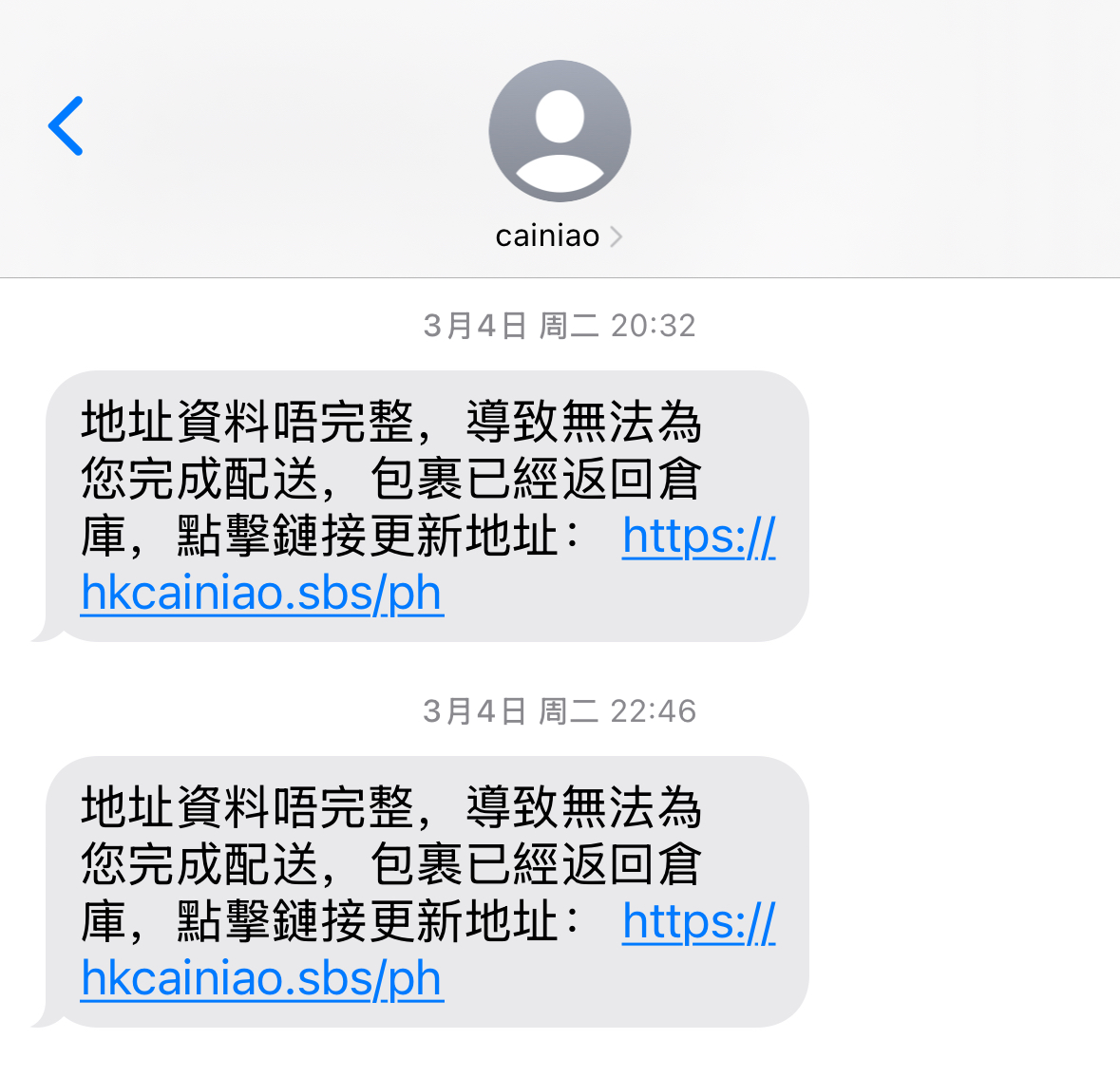 騙徒假冒菜鳥(CAINIAO)官方人員,發送訊息謊稱用戶的「地址資料不完整」,聲稱無法派送包裹。如果在他們的連結中輸入自己的個人資料,就會掉入陷阱,面臨財產損失。所以在提供個人資料之前,一定要三思!
