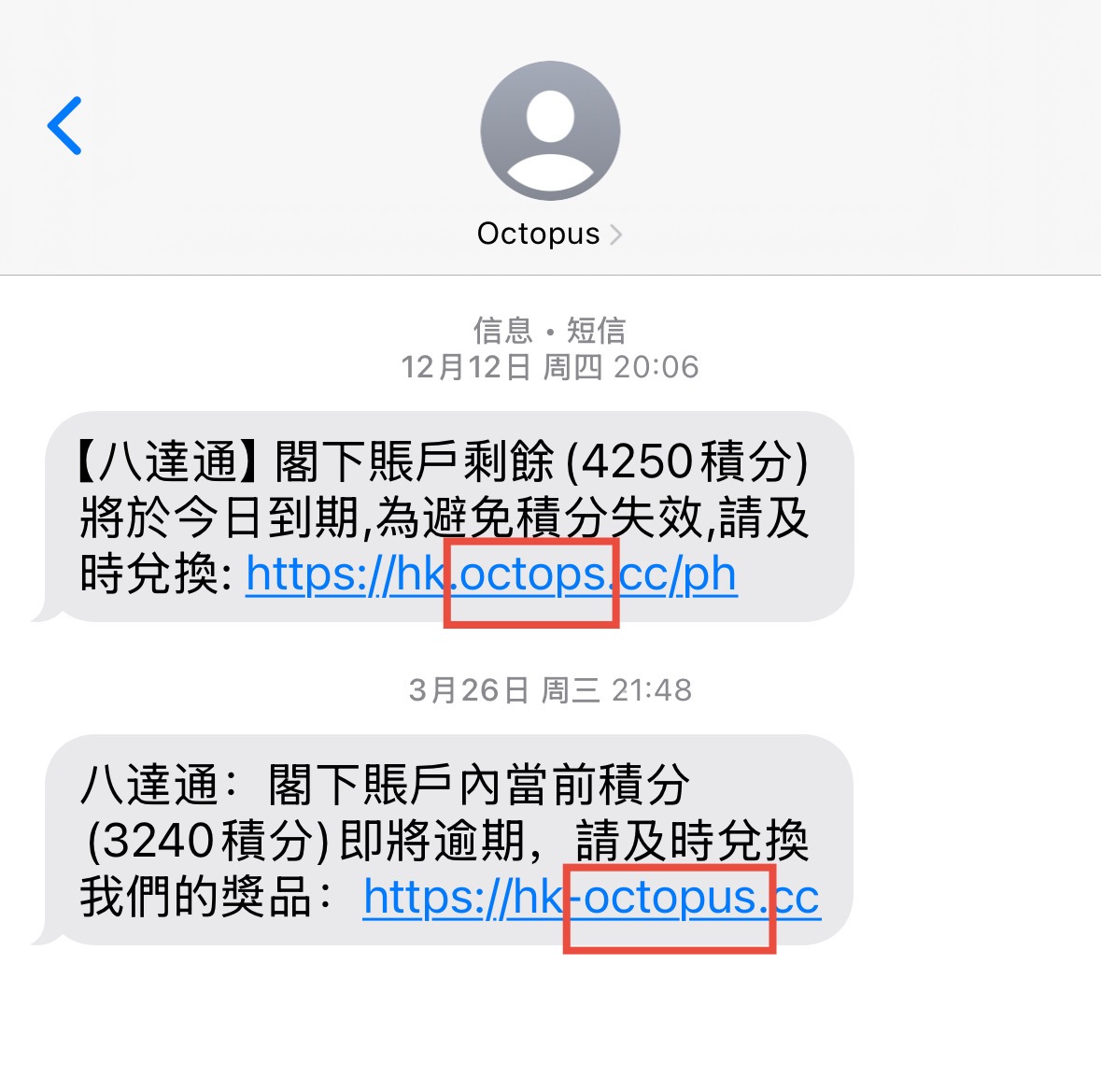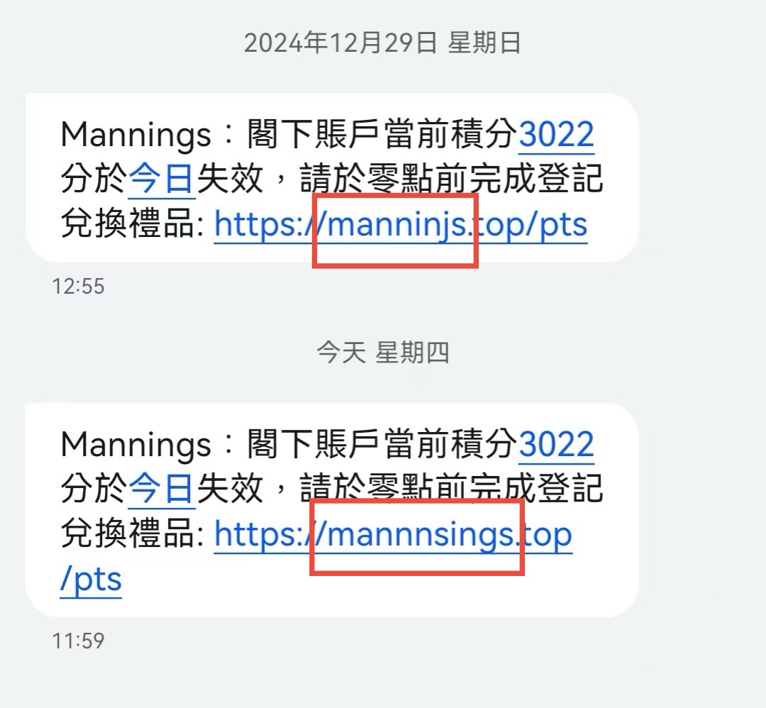 騙徒假冒八達通或萬寧的官方人員,發送訊息謊稱用戶「積分即將逾期」,需要盡快在他們提供的連結中換取獎品。但仔細看可以發現:在騙徒用同一個賬號發送的兩則訊息中,所提供的偽造網站連結都不相同,仔細判斷即可識破。細心,就是守護自己財物的最有力的「武器」。