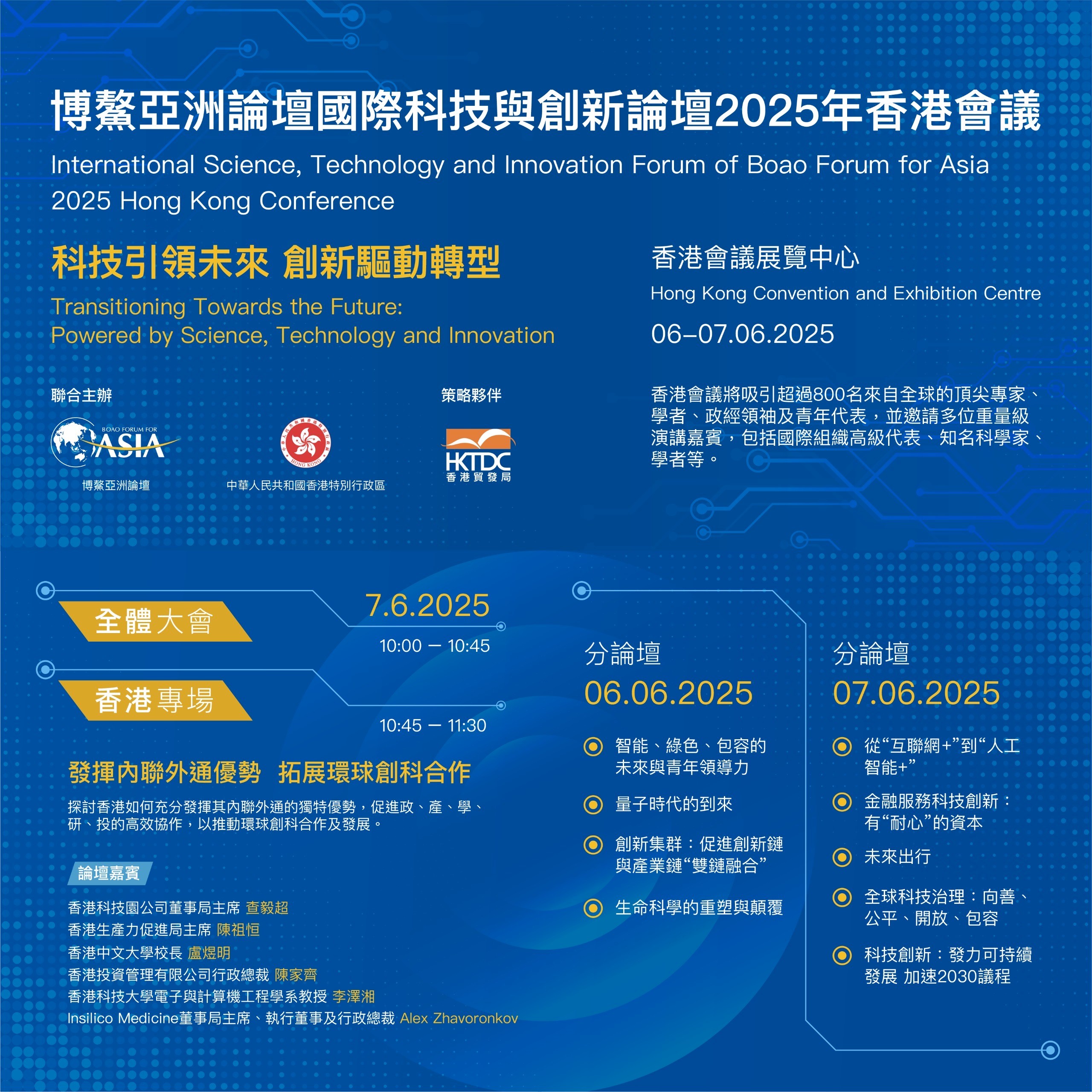 今次香港會議以「科技引領未來,創新驅動轉型」為主題,預計將吸引超過800名海內外的專家、學者及政經領袖參加。除了6月7日上午舉行全體大會外,會議亦設立分論壇,探討多個熱門創科議題,如綠色化、創新集群、生命健康及人工智能等。本次會議將特別設香港專場,以「發揮內聯外通優勢 拓展環球創科合作」為題探討香港如何充分發揮「內聯外通」的獨特優勢,促進「政、產、學、研、投」高效協作,以推動環球創科合作與發展。香港專場邀請了多位香港不同領域的知名專家及政商領袖參與討論,包括香港科技園公司董事局主席查毅超博士、香港生產力促進局主席陳祖恒議員、香港中文大學校長盧煜明教授、香港投資管理有限公司行政總裁陳家齊女士、香港科技大學電子與計算器工程學系教授李澤湘教授,以及英矽智能Insilico Medicine創始人兼首席執行官Dr Alex Zhavoronkov。