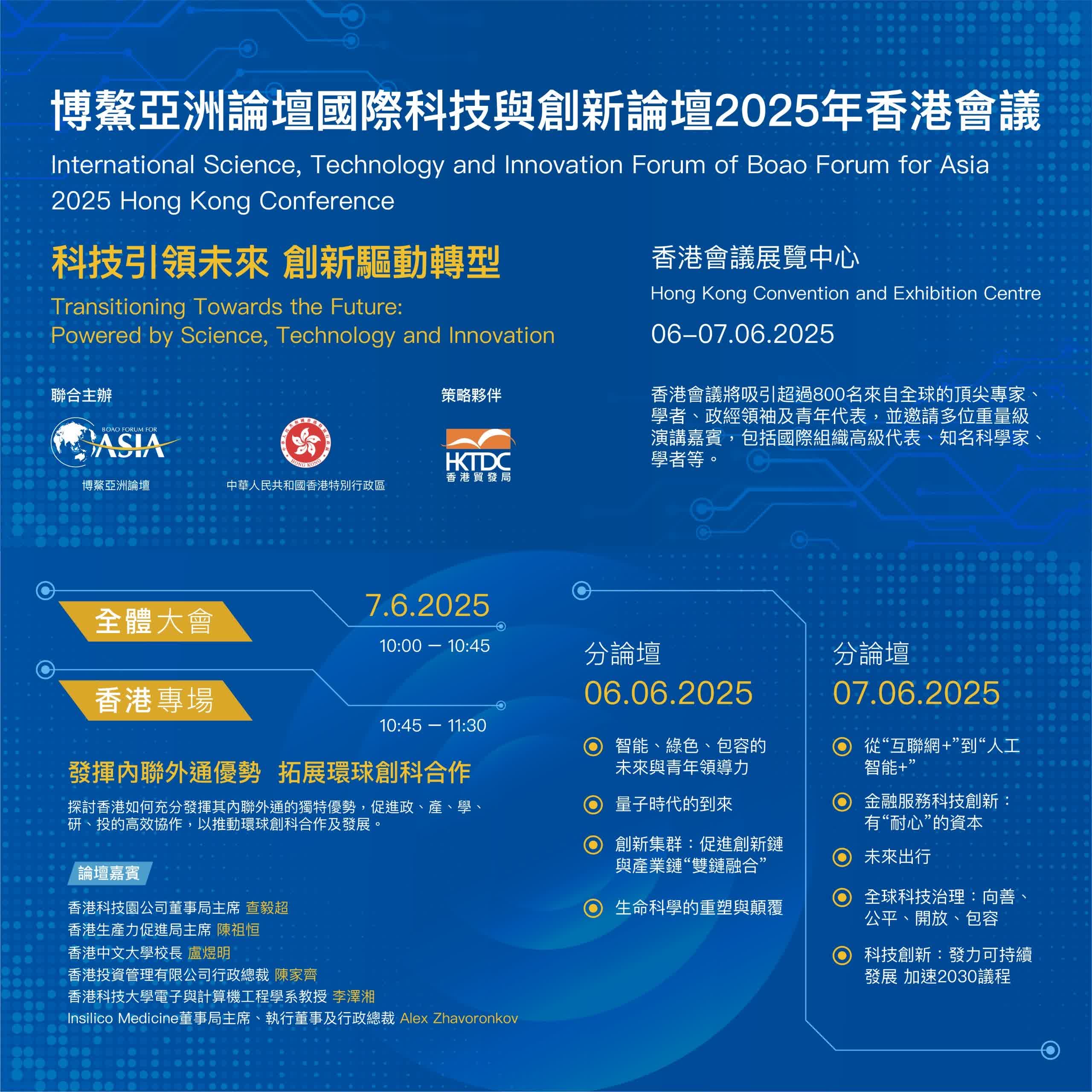 國際創科盛事「博鰲亞洲論壇國際科技與創新論壇2025年香港會議」(香港會議)將於今個星期五至六(6月6日至7日)在香港舉行。孫東指出,今次香港會議以「科技引領未來,創新驅動轉型」為主題,預計將吸引超過800名海內外的專家、學者及政經領袖參加。本次會議香港專場邀請多位香港不同領域知名專家及政商領袖參與討論,包括香港科技園公司董事局主席查毅超博士、香港生產力促進局主席陳祖恒議員、香港中文大學校長盧煜明教授、香港投資管理有限公司行政總裁陳家齊女士、香港科技大學電子與計算器工程學系教授李澤湘教授,及英矽智能Insilico Medicine創始人兼首席執行官Dr Alex Zhavoronkov。