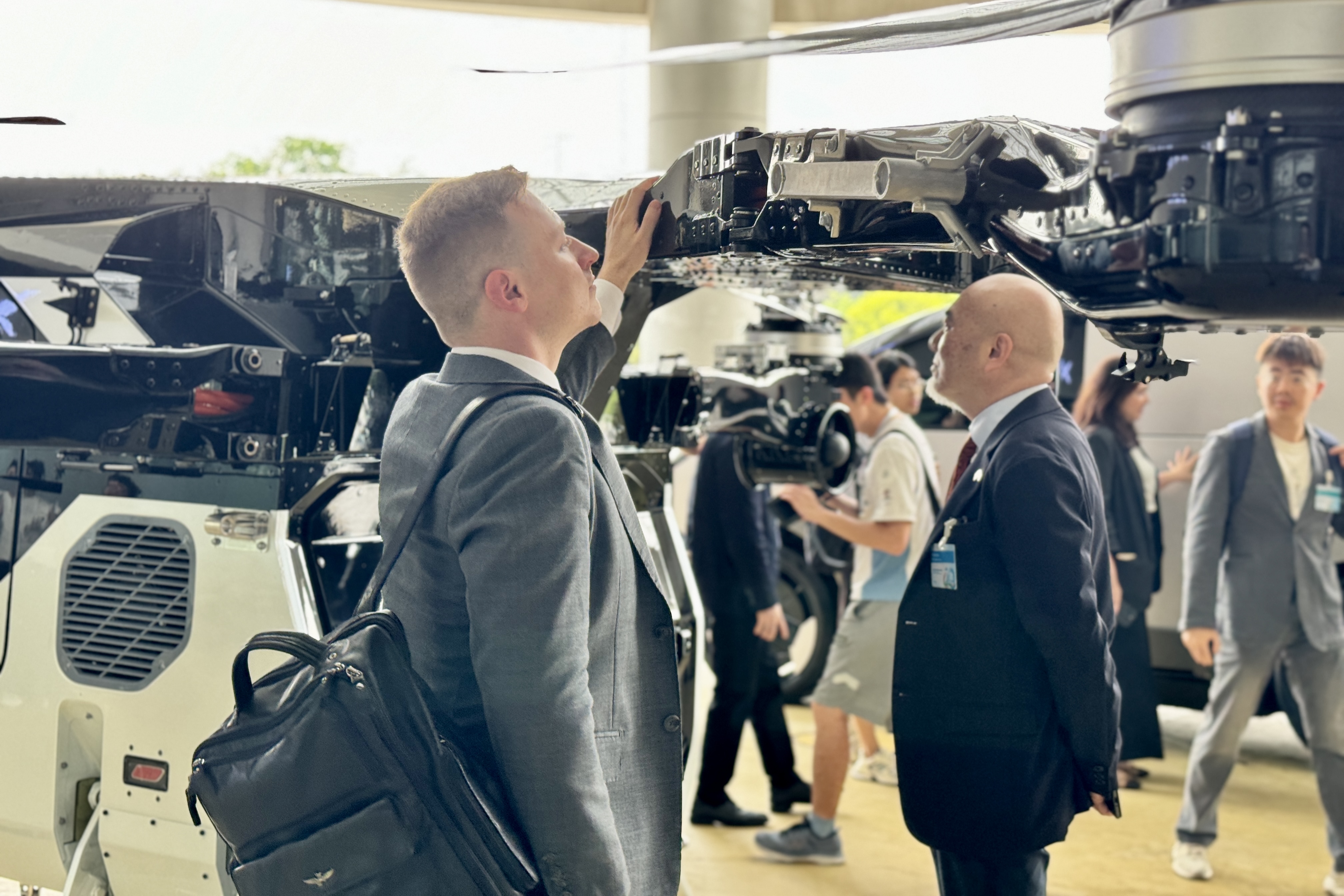 「如何保證飛行安全?」「你們的意向訂單主要來自哪些市場?」「這台汽車起到什麼作用?」……既能像普通汽車一樣在公路上飛馳,又能「一鍵起飛」穿梭於低空空域,小鵬匯天最新的分體式飛行汽車「陸地航母」吸引了參訪團的目光,代表們極近距離地觀察了這架「飛機」的每一個細節,圍着工作人員詢問了諸多細節。