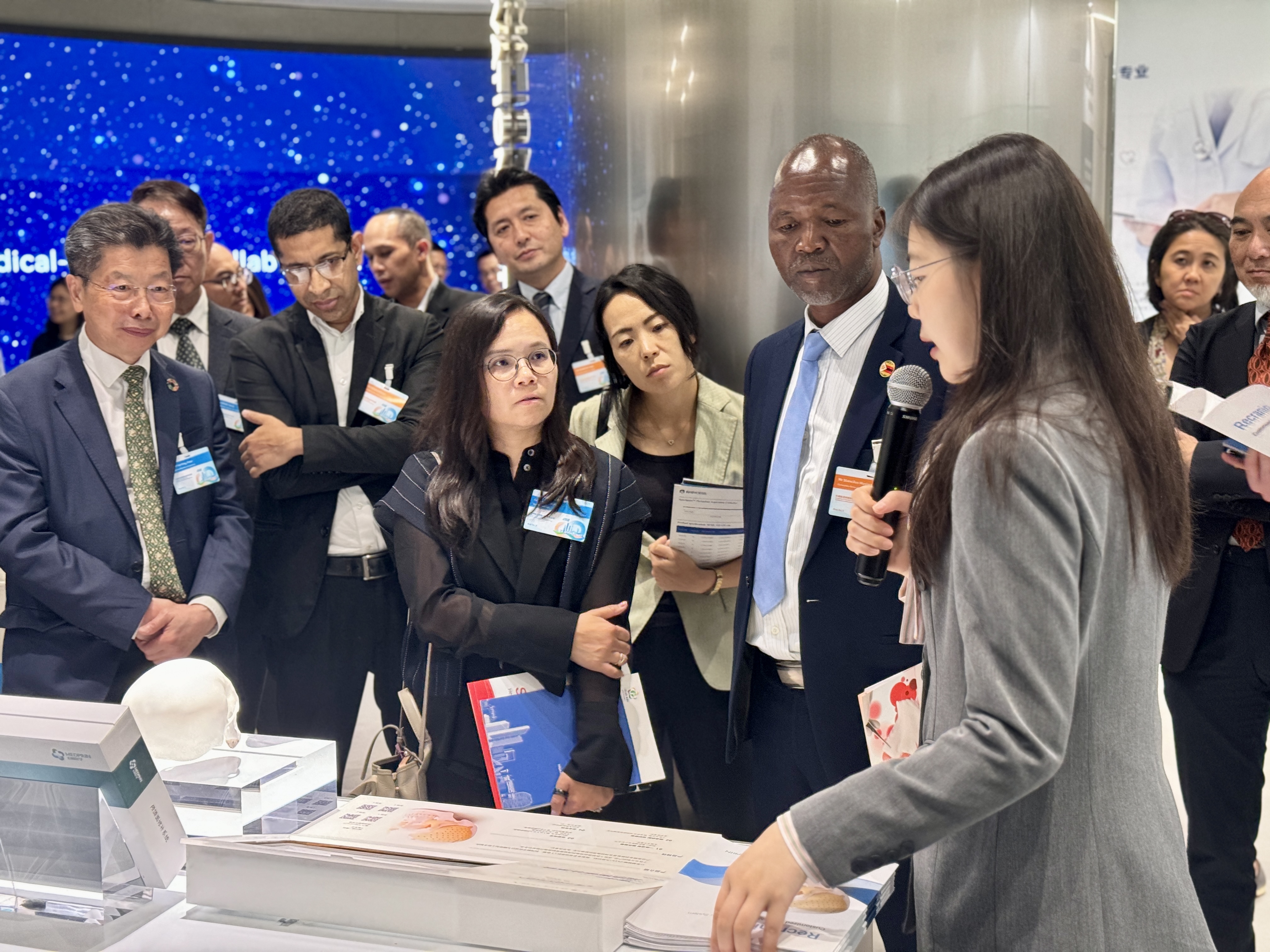 在邁普醫學IHM.GBA粵港澳大灣區高性能醫療器械創新中心,分層易塑形、抑菌可吸收的再生氧化纖維素止血耗材,具有無創柔軟頭端、可滿足腦卒中缺血和出血等各種術式需要的遠端通路導管系統,還有利用計算機輔助設計和生產、無需術中塑形的顱頜面修補系統等先進醫療器械創新技術,也讓參訪團代表們不停端詳觀察。