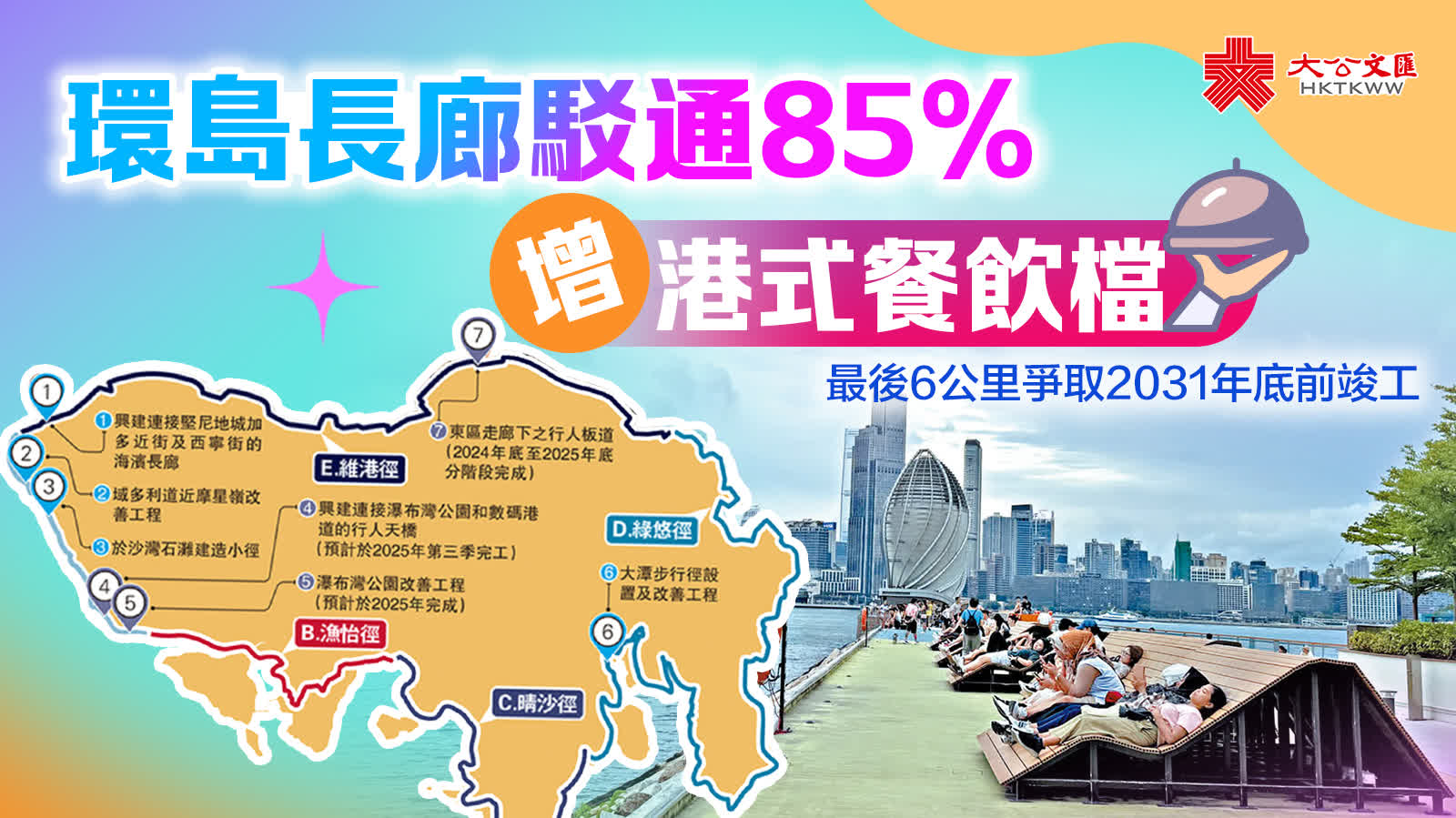 (大公報 記者 劉碩源<文> 麥潤田、何嘉駿<圖>)維港兩岸風景優美,是旅客必到的打卡景點。特區政府於2022年提出,在港島海濱建造全長60公里的「活力環島長廊」。發展局局長甯漢豪昨日表示,「活力環島長廊」已駁通八成半,預計2027年年底前駁通九成長廊。為豐富遊客的體驗,政府在海濱增設餐飲設施,繼早前已啟用的智能售賣點後,發展局年內將邀請有興趣的營運者,在中環、灣仔、北角和尖沙咀海濱,加設輕食飲品攤檔。甯漢豪形容,不要求食物種類「石破天驚」,希望是售賣有香港特色的食物。