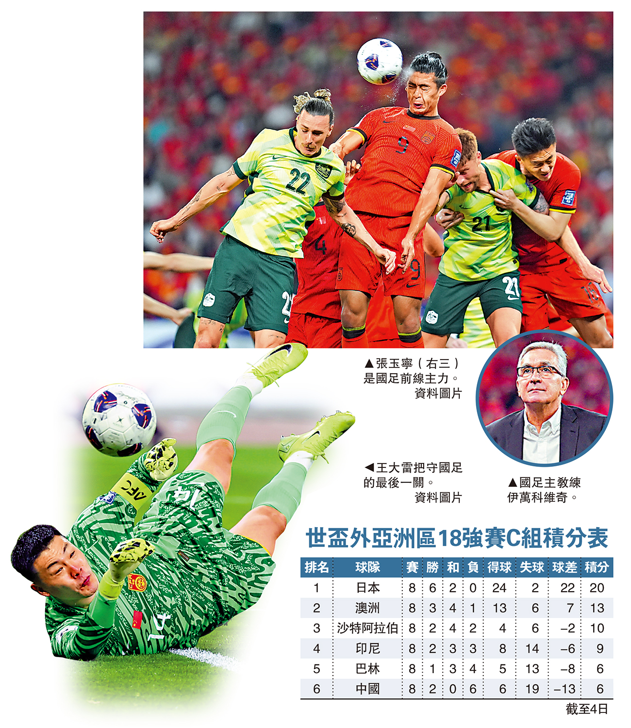 國足於本屆世盃外由第2階段打起,最終力壓泰國而以次名晉級18強賽。18強賽中,國足與日本、澳洲、沙特阿拉伯、印尼及巴林同組,初段一度錄得3連敗,當以為失去晉級希望時,卻又連挫印尼及巴林而重獲出線機會。雖然國足目前已經無緣直通世盃決賽周,但仍有力保晉級至第4階段的附加賽機會,因為國足與尾二的巴林同分、僅輸得失球差,另與第4的印尼亦僅差3分而已。